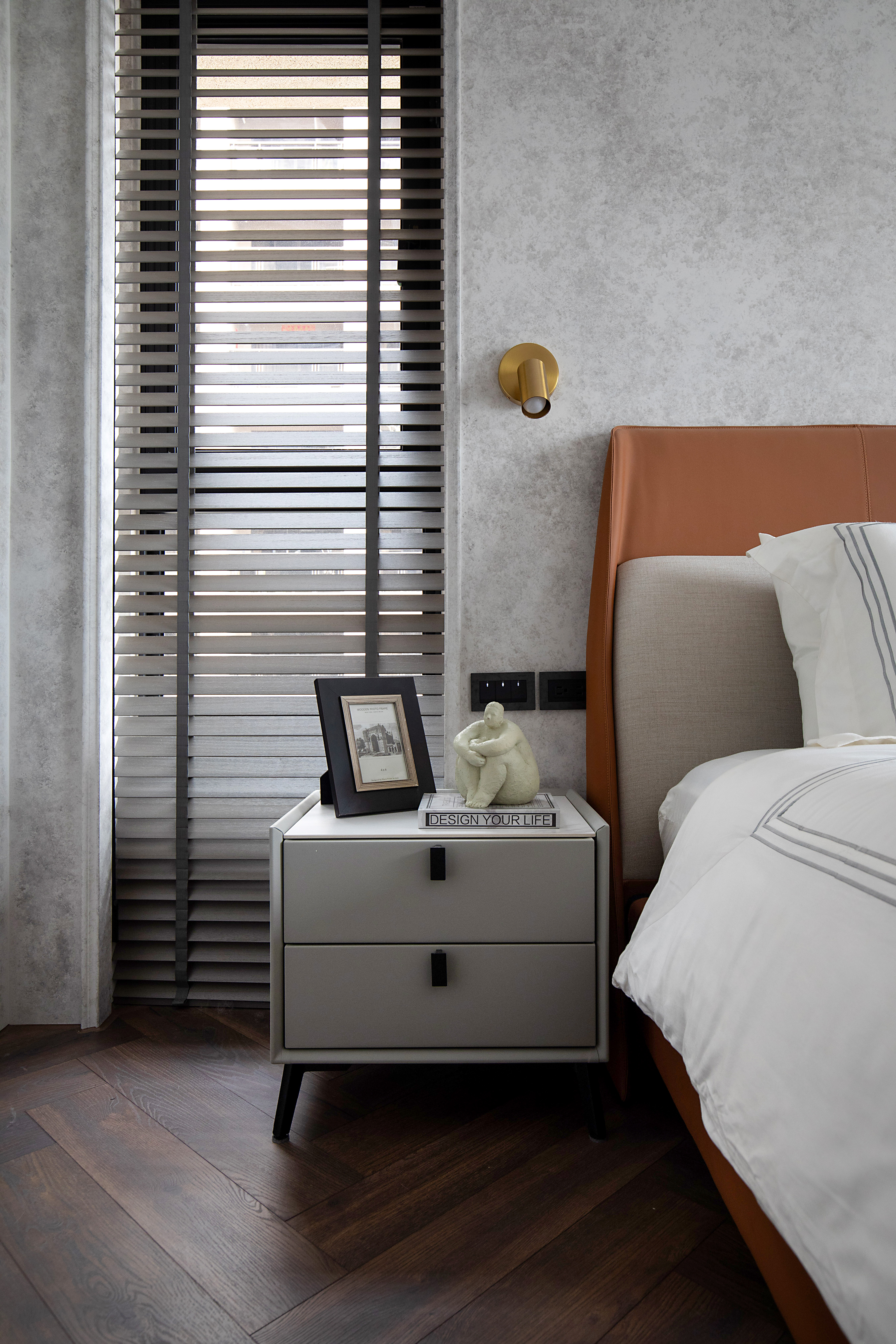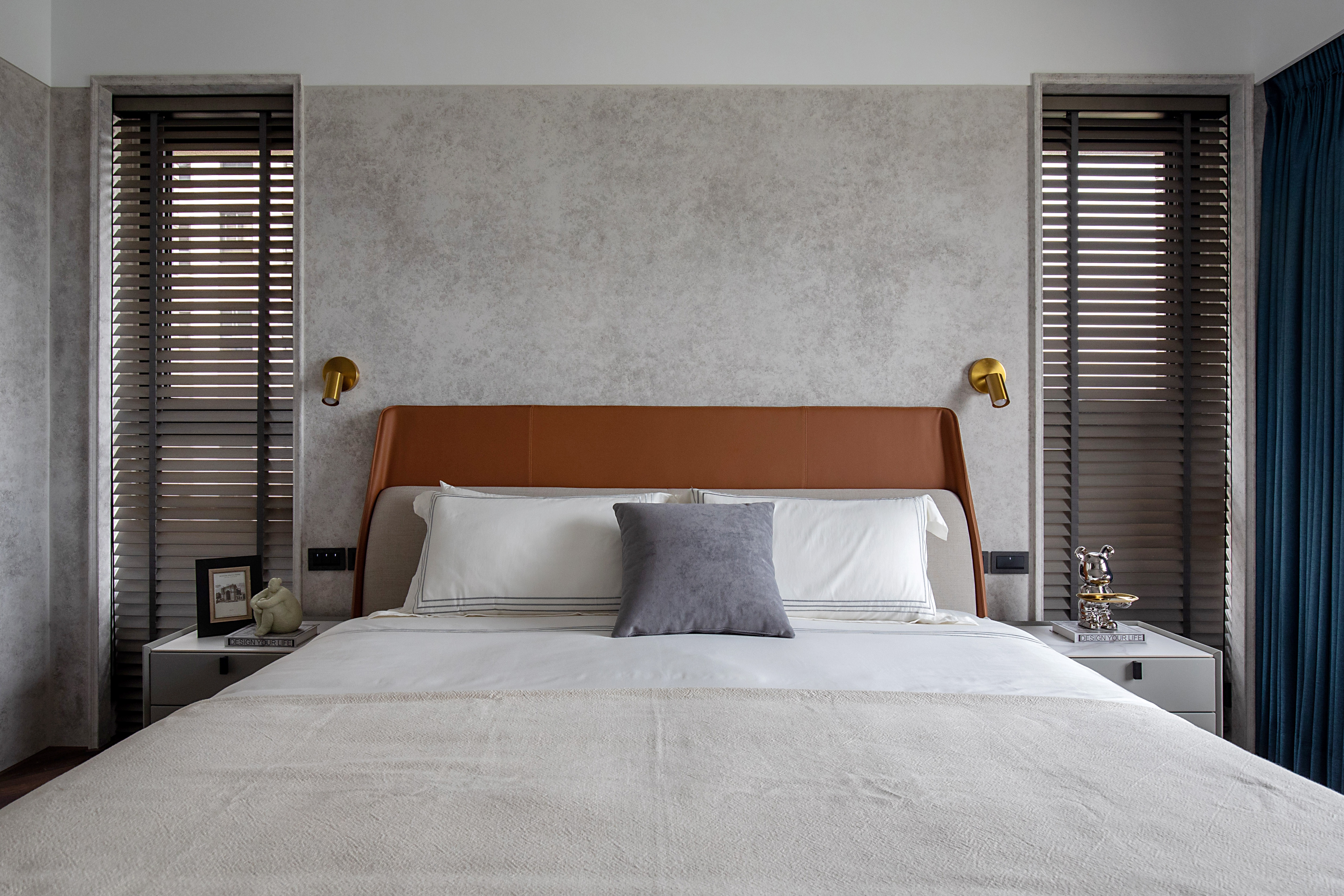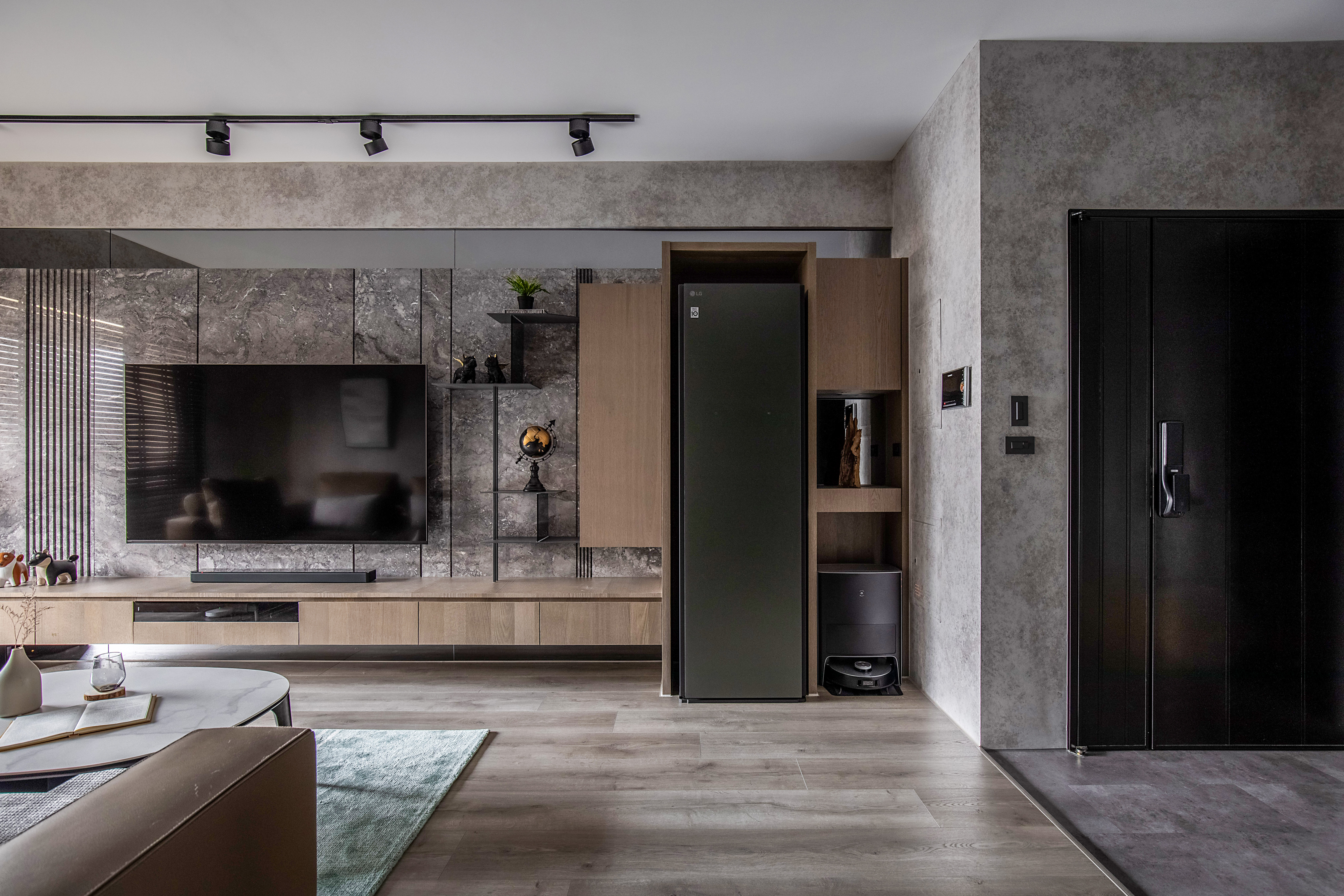 The designer found inspiration in the Taroko Gorge, one of Taiwan’s many natural wonders. Rock-colored walls made with faux finish create a harmonious, organic space. The abstract imagery of ocean waves becomes the lines on the marble stone TV walls, adding visual rhythm.