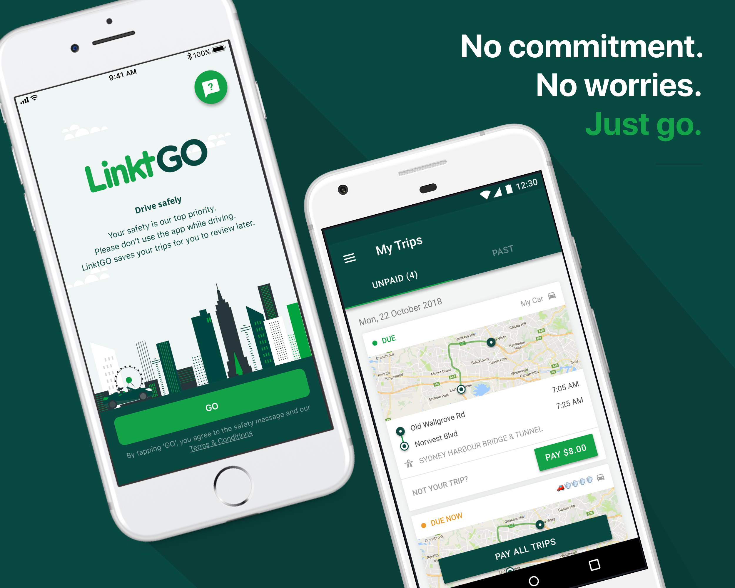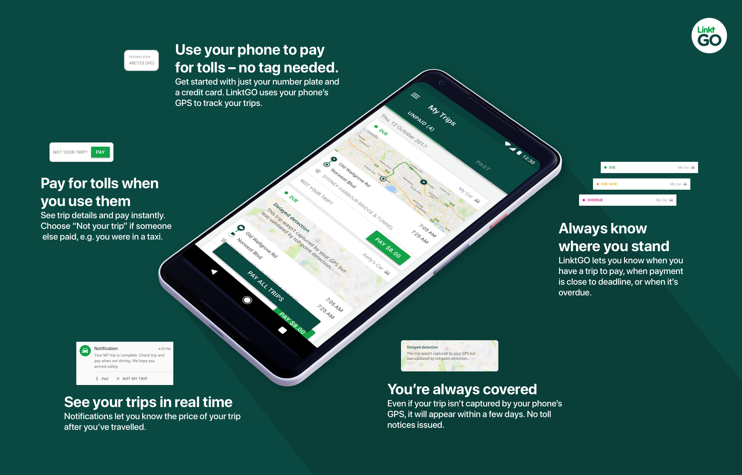 The LinktGO app uses a smartphone’s GPS technology to identify when a driver has entered and exited any Australian toll road, replacing the need for a tag.
