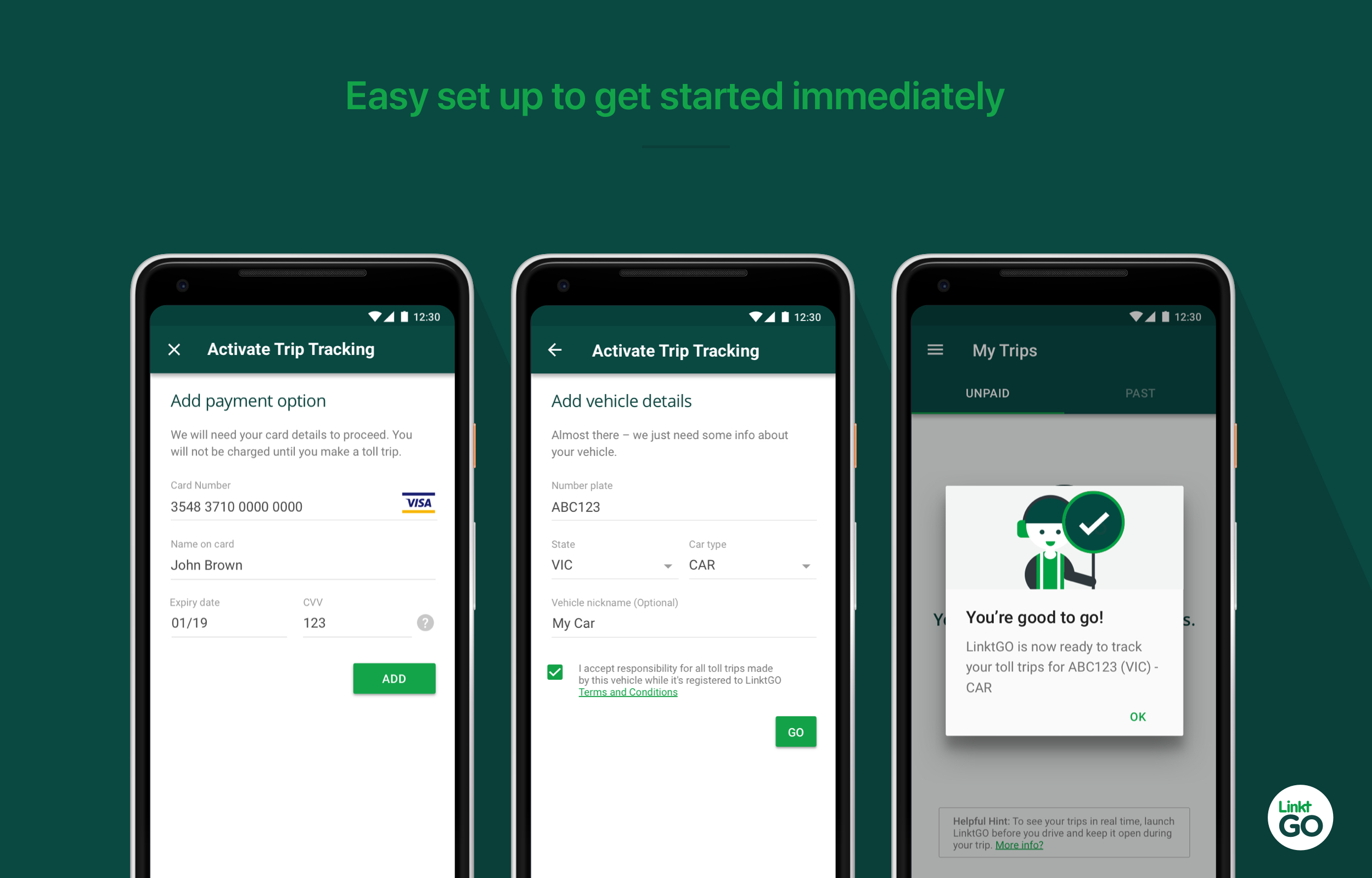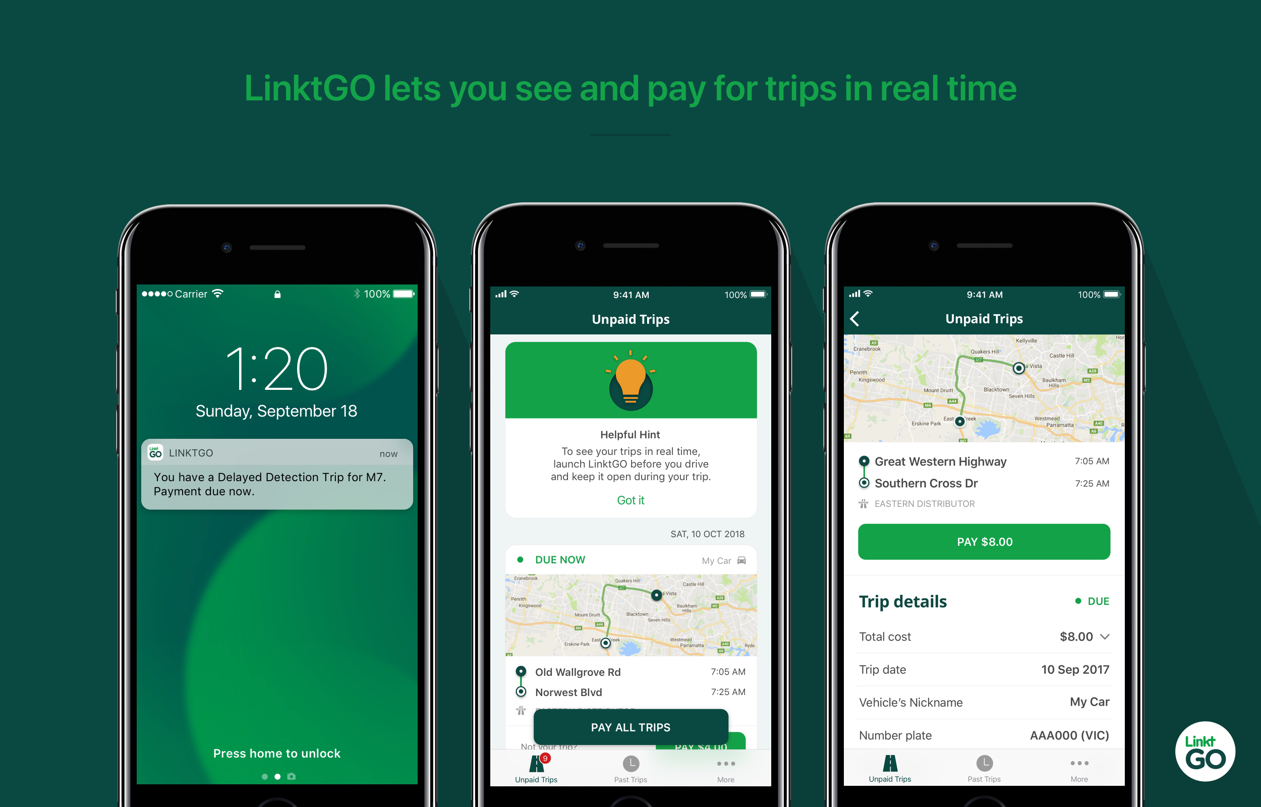 The LinktGO app has been designed to allow users to sign up to the service using only their mobile phone number, license plate number, and a credit card. The app provides users with clear visibility of their toll road trips, as well as associated cost breakdowns. The app also allows trip-by-trip payments and uses push notifications to remind the user when a payment is due.