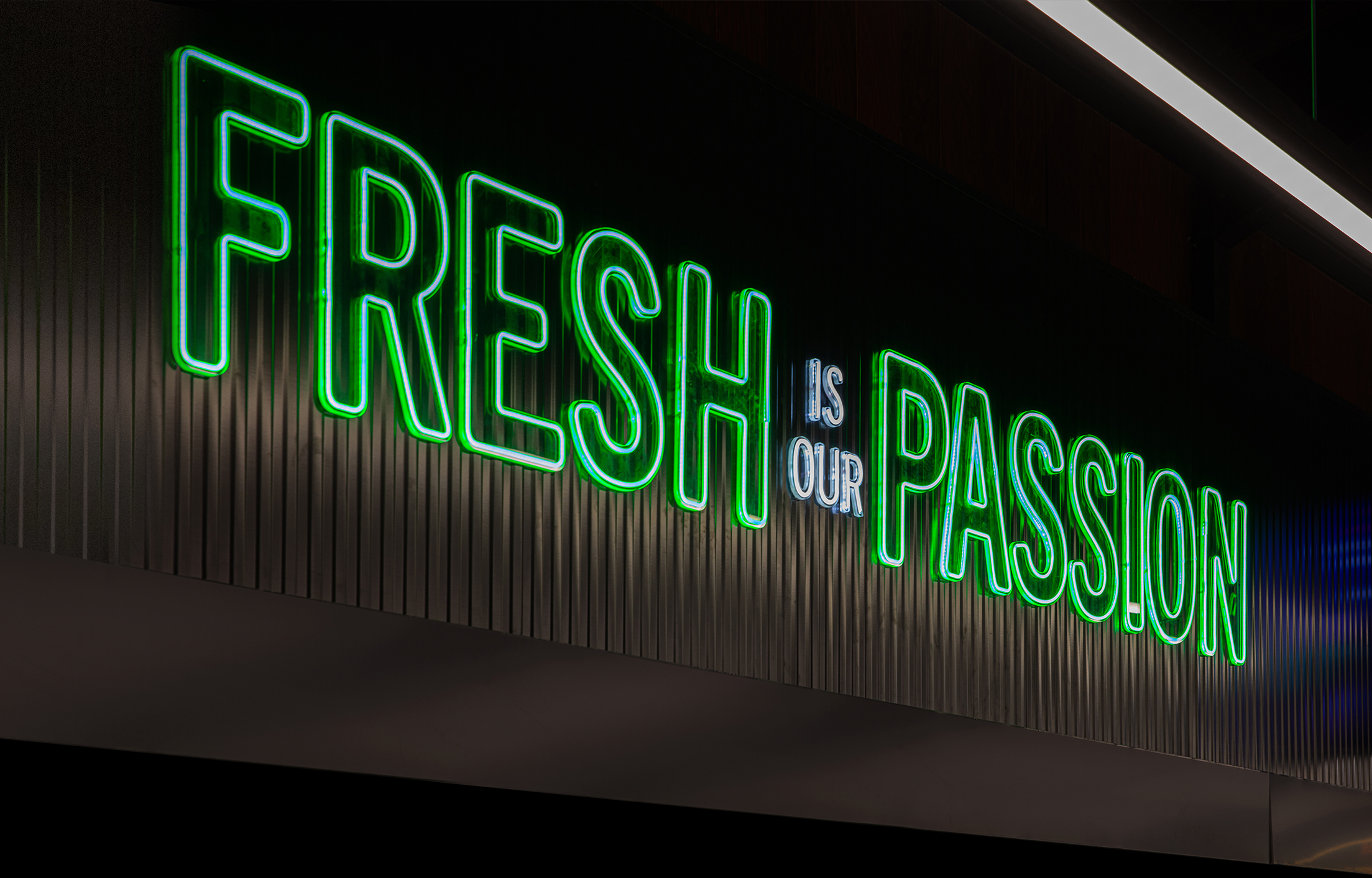 To build further on these quality cues and create a hint of a ‘night market’ atmosphere, we also concepted and developed a range of stylish neon navigation and backlit signs for the varying store zones, and invited a local artist to create a stunning mural at the entrance to each and every new store.