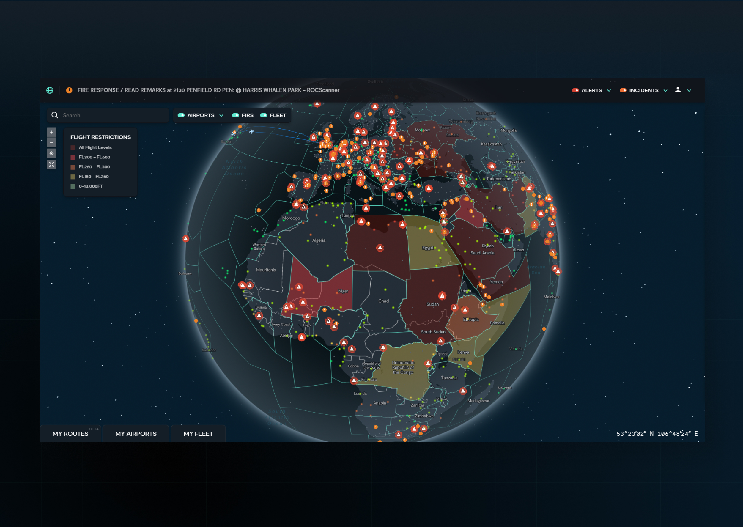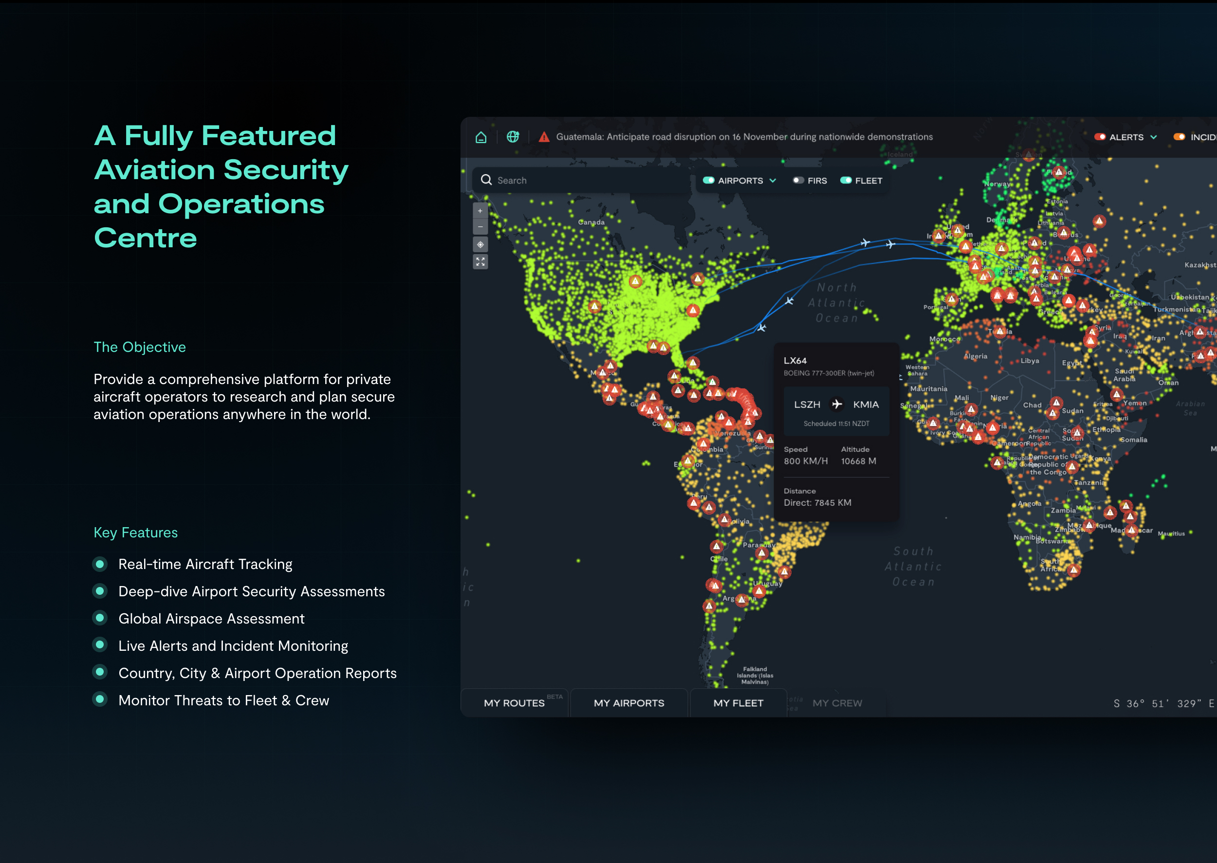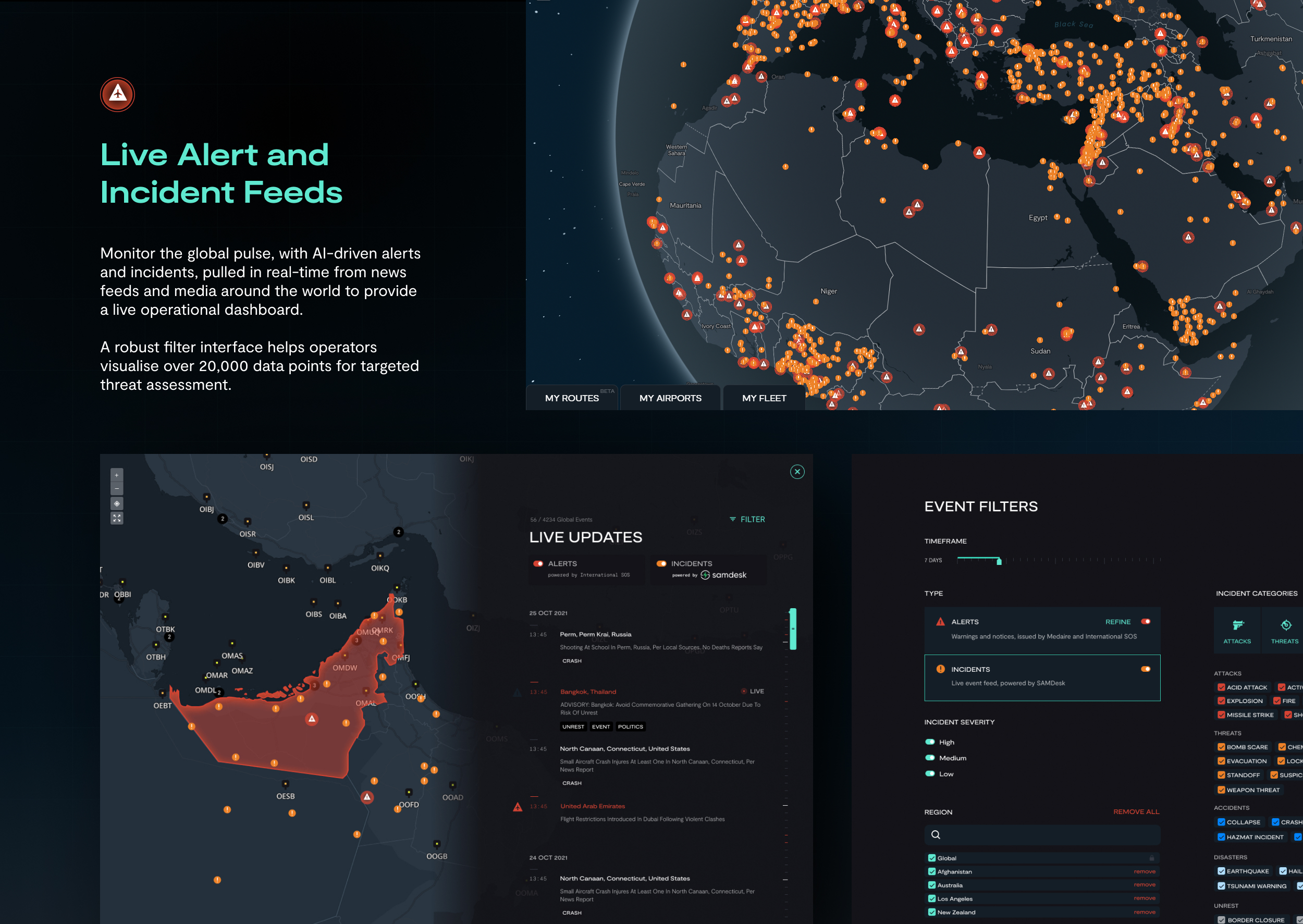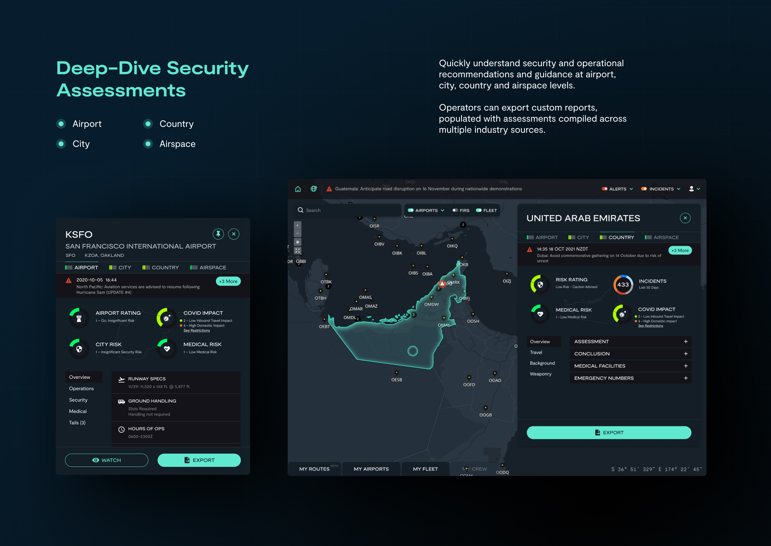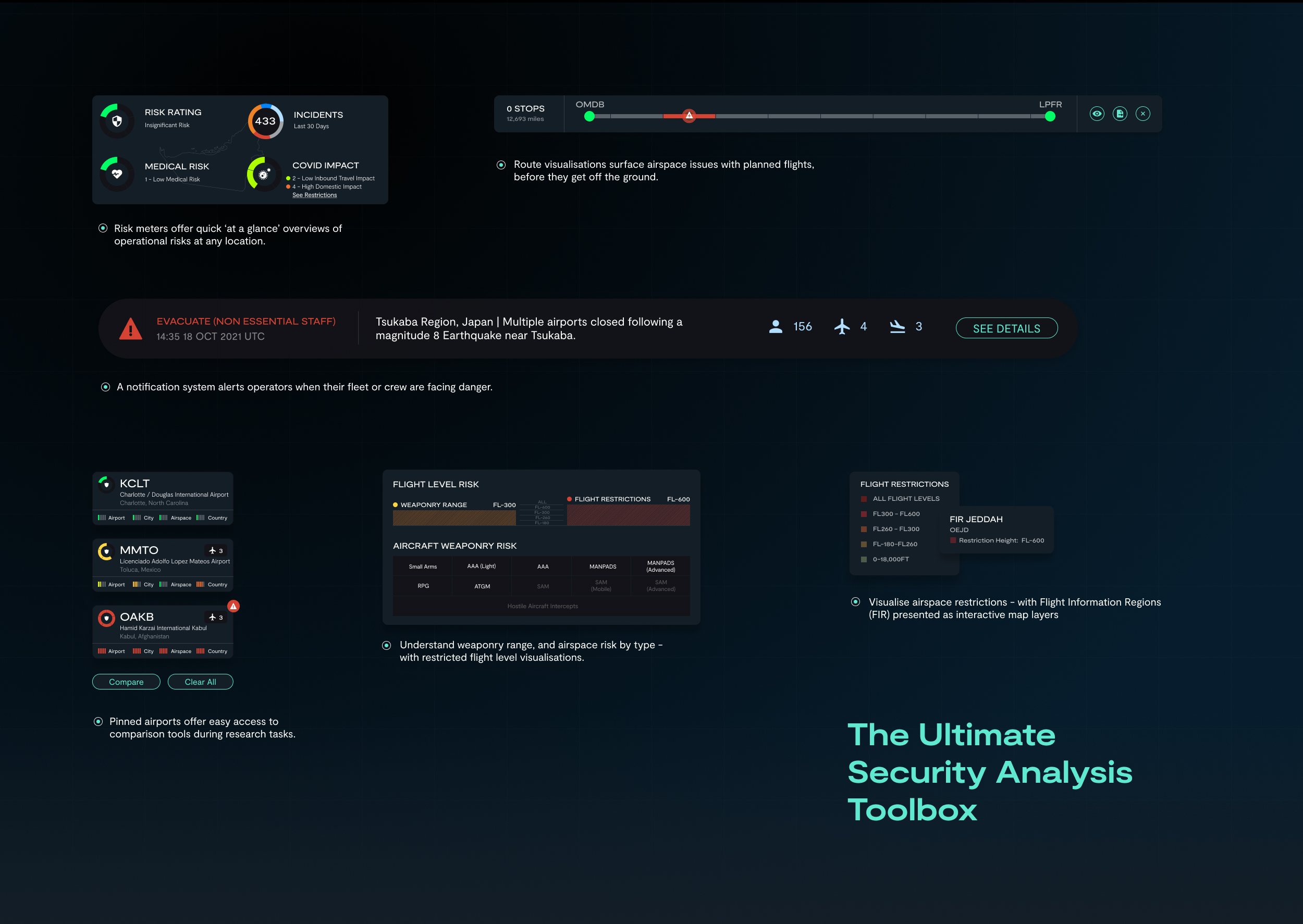 The world changed when Covid shut borders all over the world and disrupted aviation globally. The lingering impacts of the pandemic and growing geopolitical tension have highlighted the need for actionable intelligence to be readily available to flight operators organizing logistics and route planning for private aircraft fleets. With MedAire360, the team imagined a new portal from the ground up, one that would have a visual user interface allowing a snapshot of global risks with the ability to drill down into greater detail at an airport, city and country level. The portal needed to accommodate dozens of API data feeds, including risk alerts based on machine learning analysis of unofficial information sources, such as news agency alerts and social media posts. There was a particular need to move away from the heavily text-based information sources of the past to create color-coded risk indicators, icons and fonts that would ensure busy MedAire360 users could see the status of their aircraft and relevant risk alerts at a glance.
