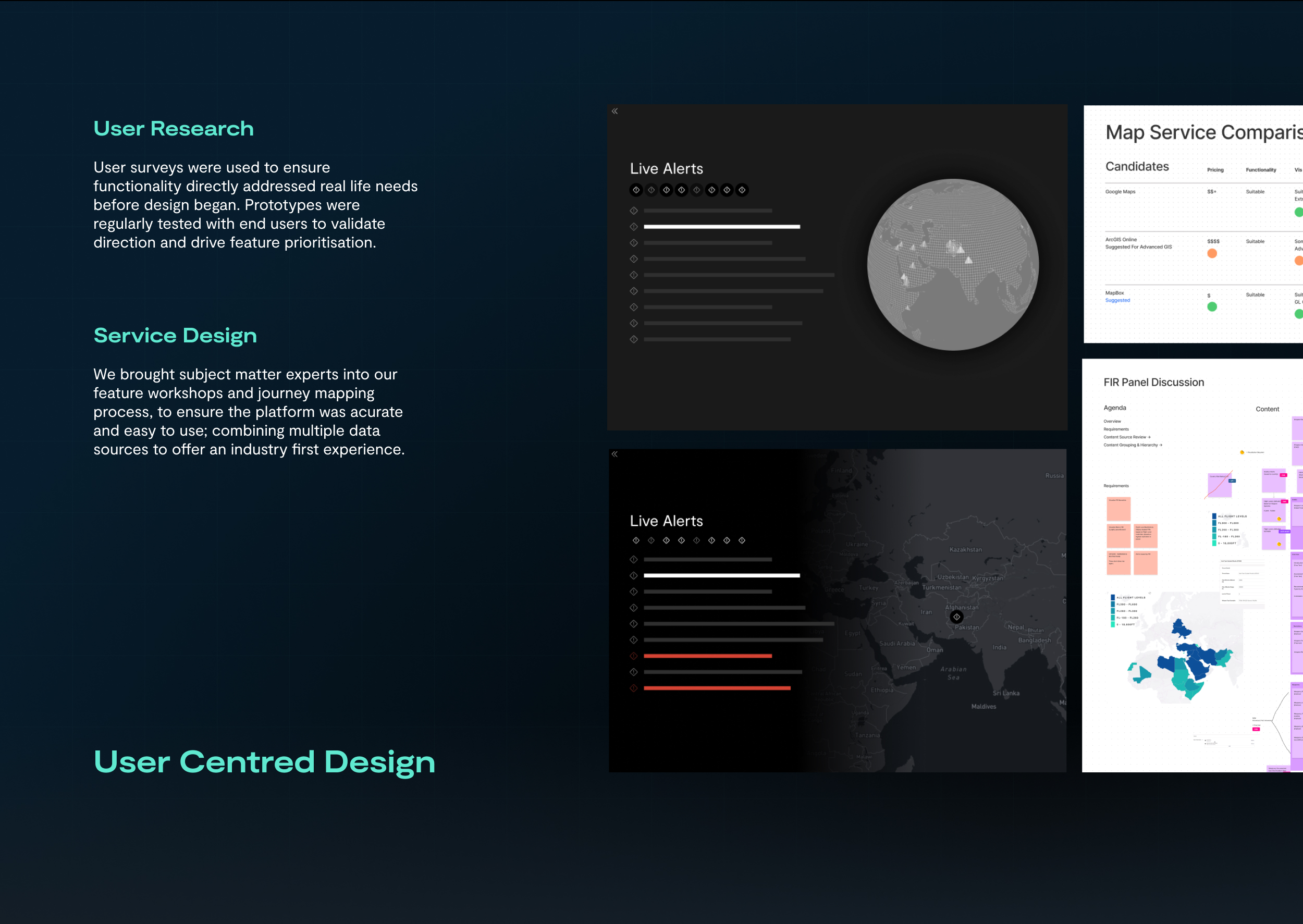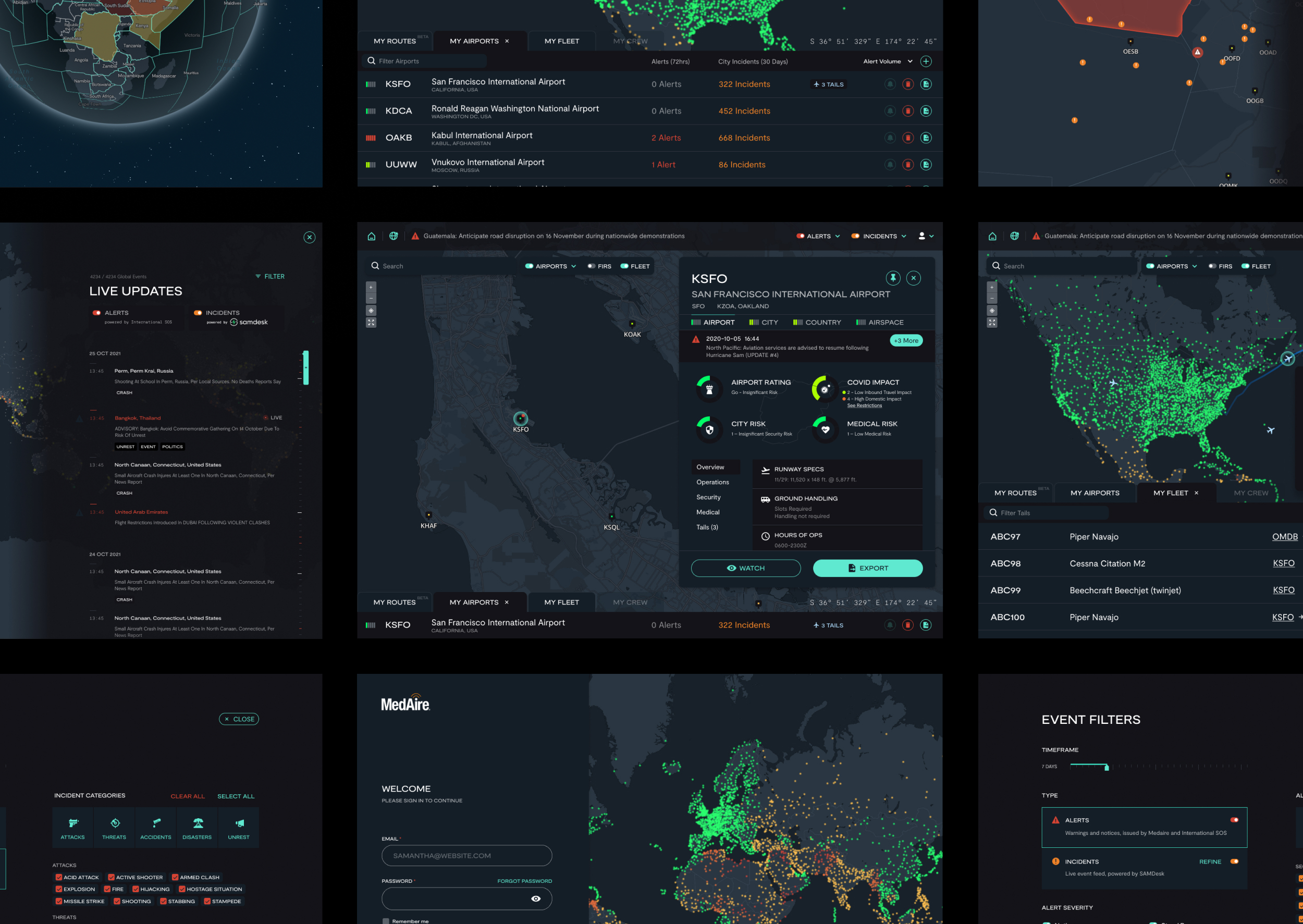 The resulting MedAire360 portal has reimagined the user experience for flight operators, increasing their engagement with MedAire and speeding up critical decision-making in the travel planning process. The new user interface is critical to this radically upgraded user experience. Through the design process, a dark color scheme was selected for MedAire360 to suit aviation operation centers and offering high contrast to make color-coded alerts and map points of interest easier to identify. MedAire360 offers flight operators to customize their interface to display commonly used airports and routes and to offer quick access to information on each aircraft in the fleet and its current status. The human-created alerts on airport disruption, conflicts and extreme weather events are complemented by AI-generated risk alerts drawing on unofficial data feeds (including social media), offering early warning of unfolding events that could disrupt travel. A reporting system built into MedAire allows dashboard and PDF-based reports to be instantly generated replicating the relevant information in document format. Feedback from Medaire customers suggests that MedAire360 is: - Surfacing information in a convenient format within MedAire360 enables rapid, informed decisions, and allows for richer, informed conversations with MedAire’s expert call centre team - Delivering a user interface and design experience that matches the best enterprise and consumer software applications on the market. - it’s easier to react quickly to safety and security issues, serving the best interests of MedAire’s customers all over the world.