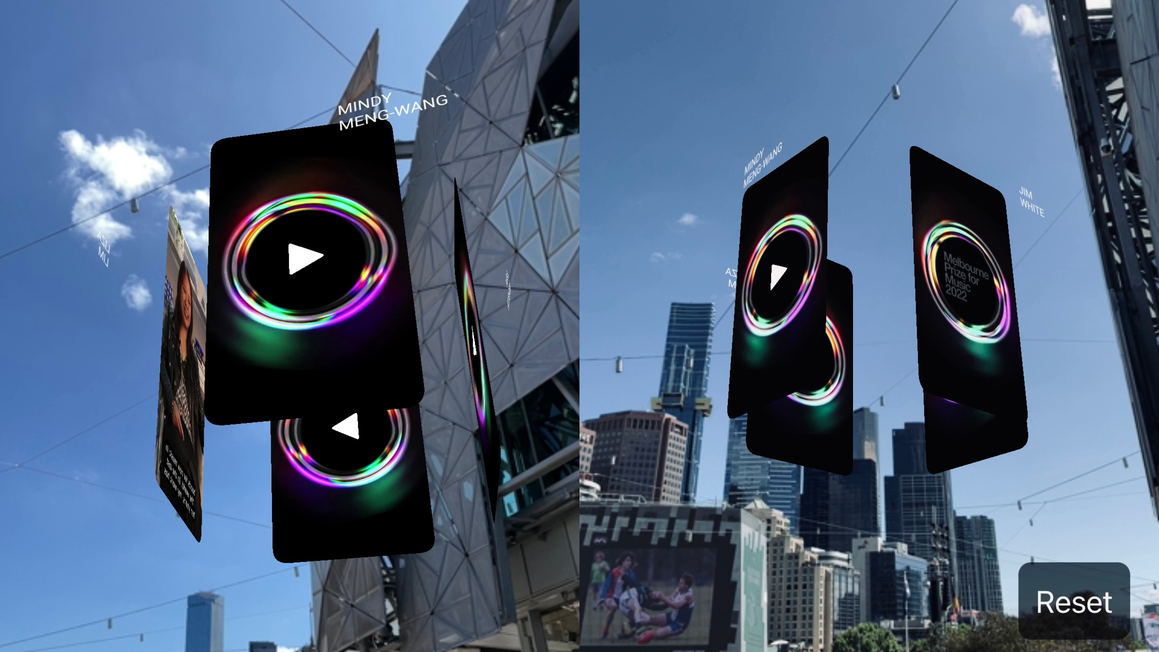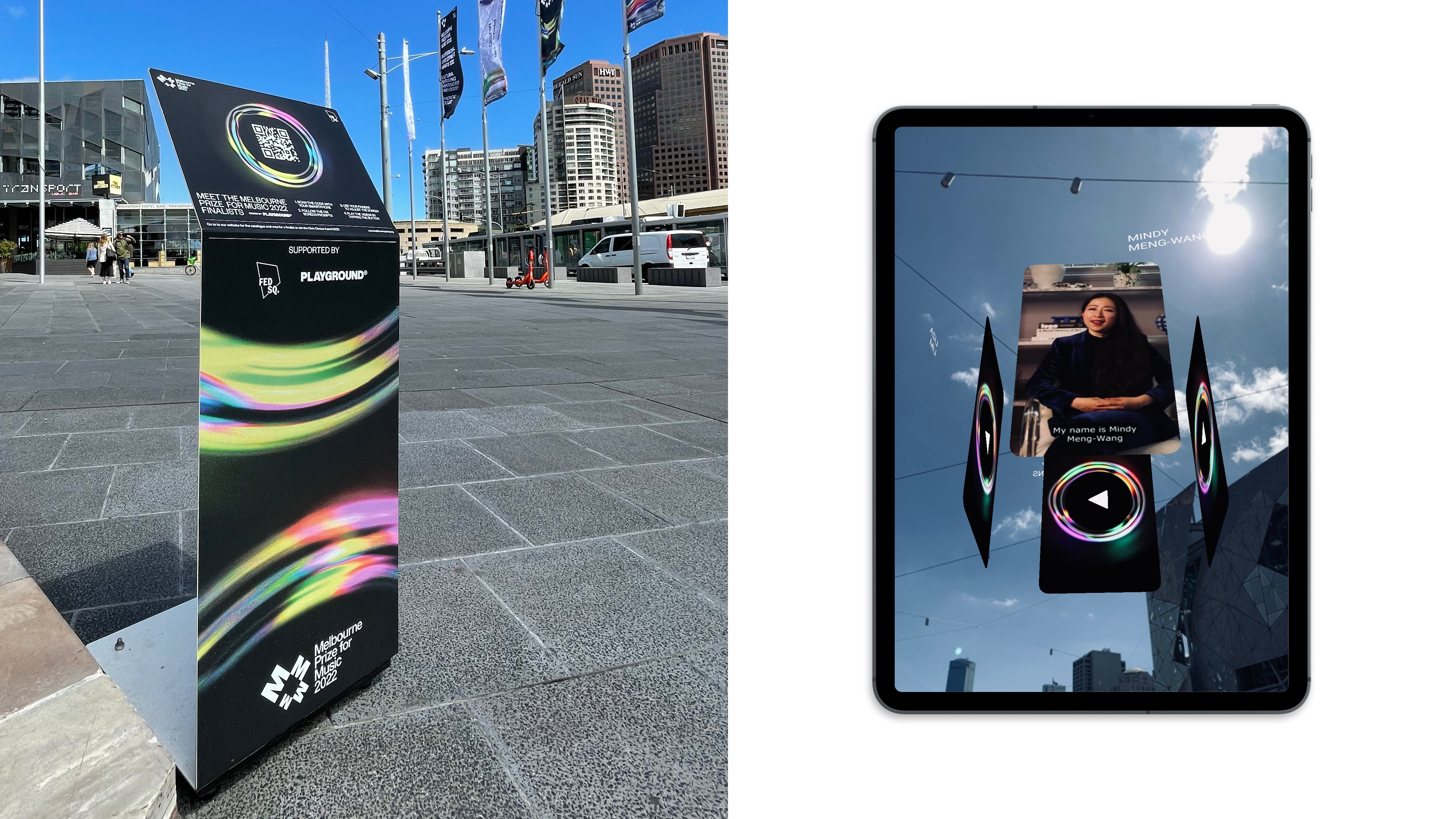 PLAYGROUND’s fresh and sophisticated brand for 2022’s music-themed Melbourne Prize was elevated to new heights of ‘engaging’ by our innovative AR experience. With QR codes located at Melbourne’s high foot-traffic zone of Fed Square, passers-by could scan the code to reveal four screens, each featuring nominees speaking about their careers and their Melbourne Prize nomination. The four screens would remain hovering in a circular shape, inviting the viewer to walk around and view all four. Through this highly engaging, intriguing and fun experience, we were able to introduce countless people to the Melbourne Prize, educate them on its importance and celebrate Melbourne’s incredible arts culture on a new digitally innovative scale.