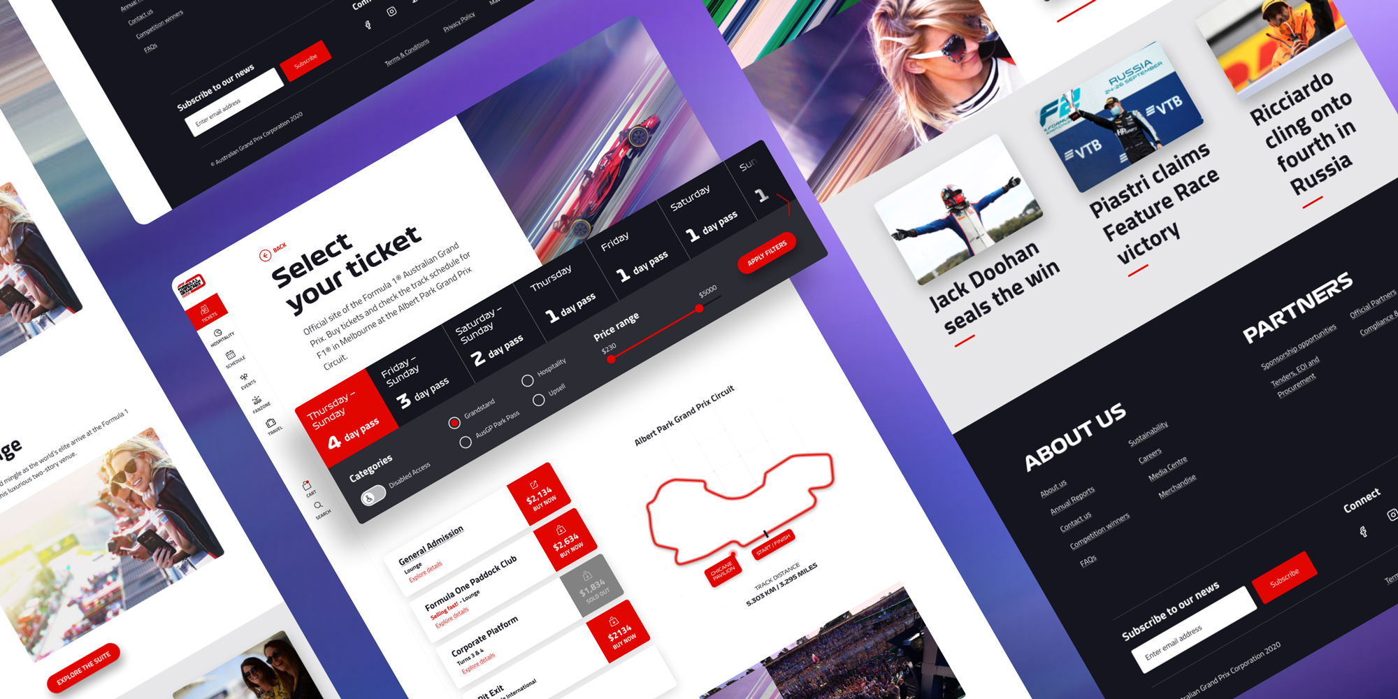 Redefining User and Customer Experience for 2 events, over 8 days, for more than 4.1 million viewers. Through widening the digital exposure the F1 Australian Grand Prix, we’re able to increase audience engagement beyond the physical event, raise opportunity for revenue and engage first-time patrons to further growth. — More than the race, we’re now able to engage audiences 365 days a year, — Bringing the World of motorsport closer to current, occasional and new fans, — Creating cultural relevancy and associations with the passion of the sport via music, fashion and film. The new platforms deliver a well-considered, tactile, and transparent information architecture helping to transform the perception of ticket scarcity and overcomes the distance and price barriers. Through widening the exposure to each event, we’re able to increase attendance, raise revenue and engage first-time patrons to further growth. Re-imagining customer experience, though a dramatically simplified ticketing tool enables great audience engagement and purchase.