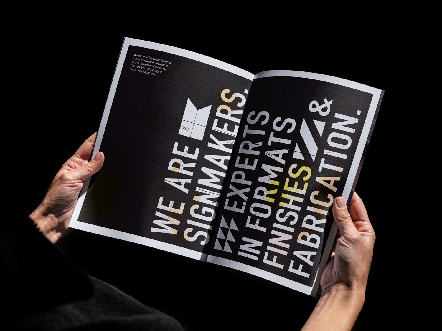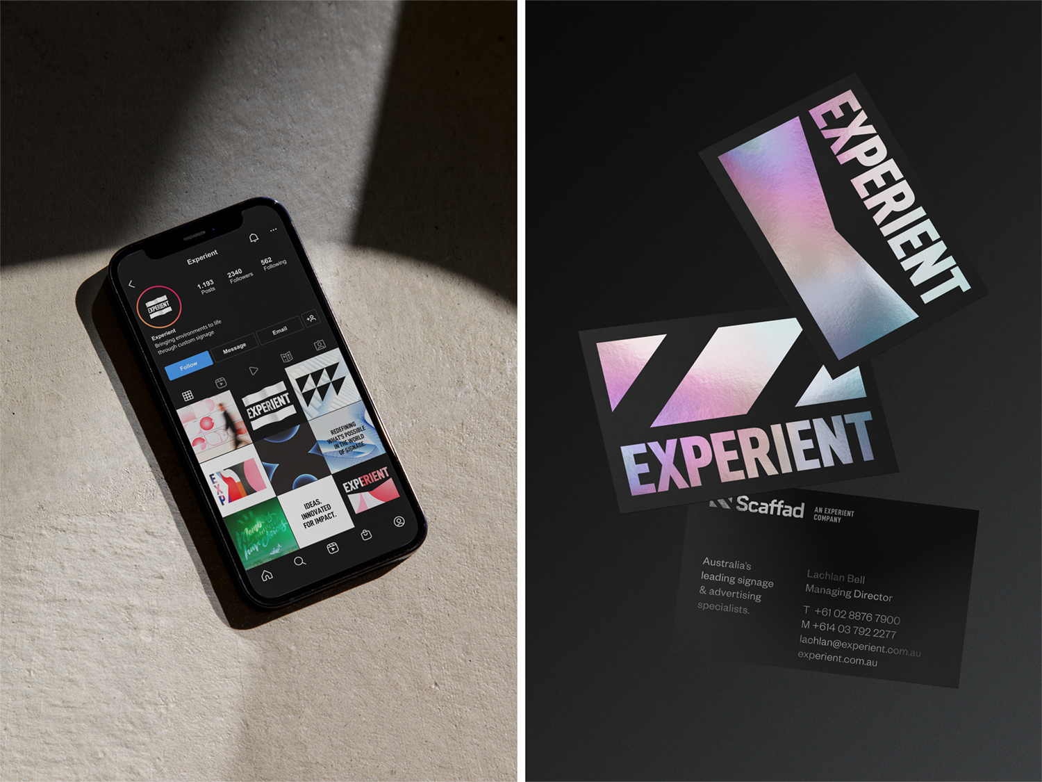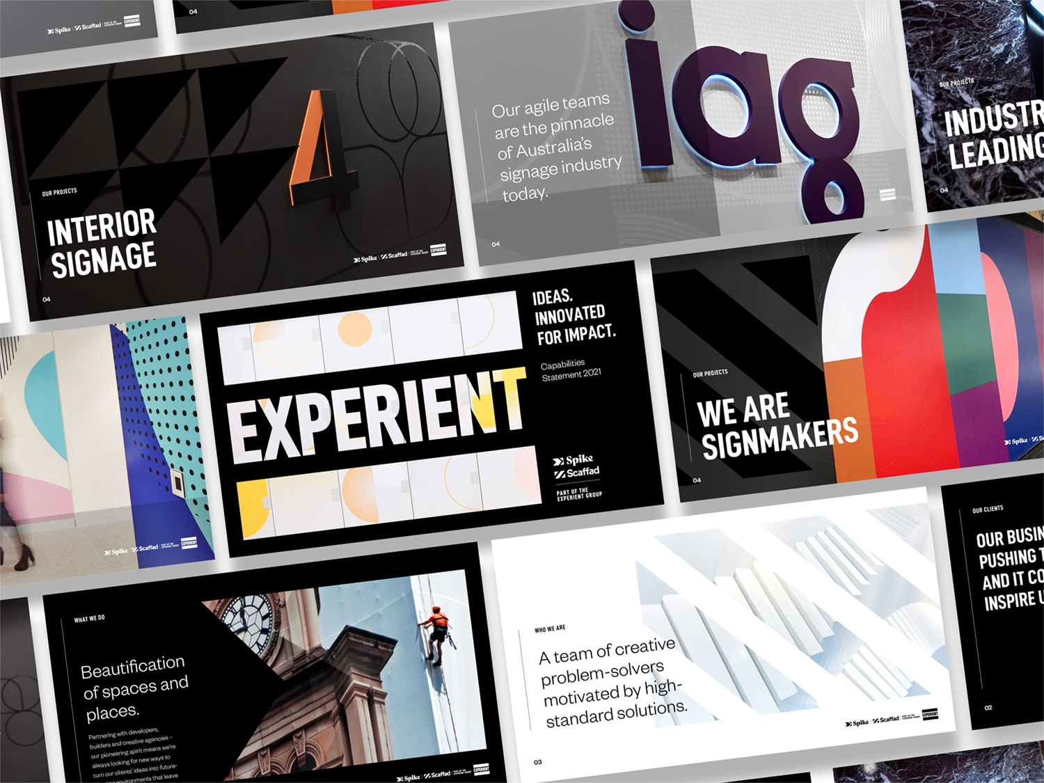 The design challenge for this project was that we had to create synthesis between two existing and established brands whilst infusing them under a new group level brand identity. To achieve this, both the original Scaffad and Spike brands were also reviewed and redesigned in line with the overall group brand, creating a stronger visual connection between two talented arms of the Experient Group. As part of the identity rollout, we developed a brand launch video, print collateral vehicle livery, social and digital assets, uniforms and presentation decks. As well as the production of a large-format quarterly newspaper-style broadsheet Experient Quarterly, designed to showcase recent work and industry insights – delivered in an altogether more tactical and tangible touchpoint. The new Experient brand successfully brings together two trusted names in Australian signage under the one umbrella. Allowing them to fly the flag for future-shaping environments for years to come.