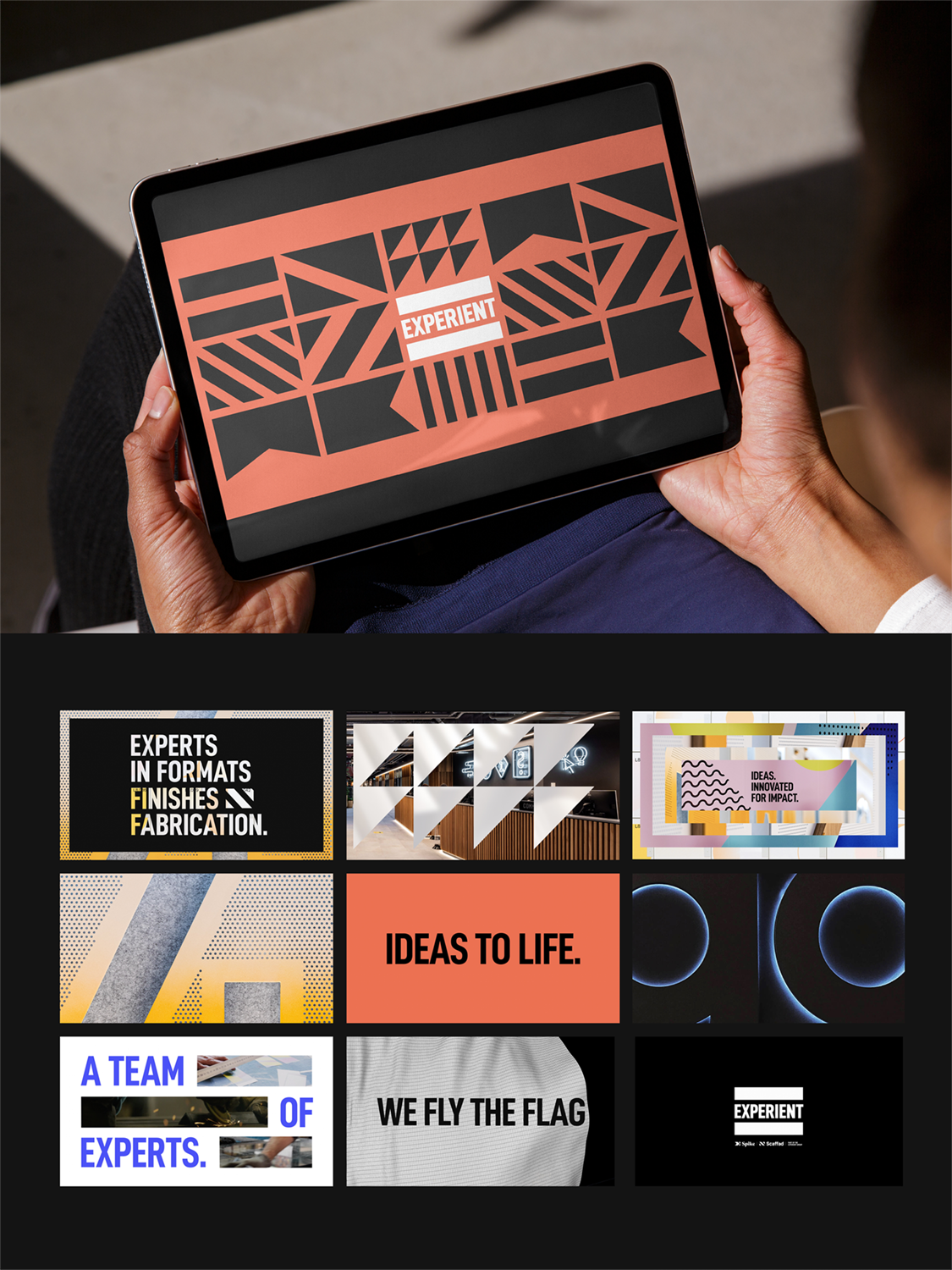 We undertook a nomenclature generation exercise that determined the new name group name ‘Experient’ inspired by its meaning ‘to have an experience’. A name that aligned with their decades of specialised expertise along with the idea that they create memorable and experiential places for people. The Experient Group specialises in amplifying its creative partner’s ideas, and through innovative materiality and engineering advice, they produce bold, well made signage that delivers real impact. As part of the brand framework we facilitated a brand discovery phase that led to a brand articulation output. We distilled their new brand positioning into one aspirational, brand-defining line ‘Ideas. Innovated for impact.’ The brand language along with the Experient logo was inspired by the idea of 'flying the flag' as Australia's leaders in signage-related services under one banner. To support this idea, a series of abstracted graphic flags that symbolised their wide network of expertise, collective strength and unrivalled reach throughout Australia. The flag graphics also serve as bold, photographic frames to showcase their striking work. Bringing colour and vibrancy to the brand whilst helping to maintaining a predominantly monochromatic palette.