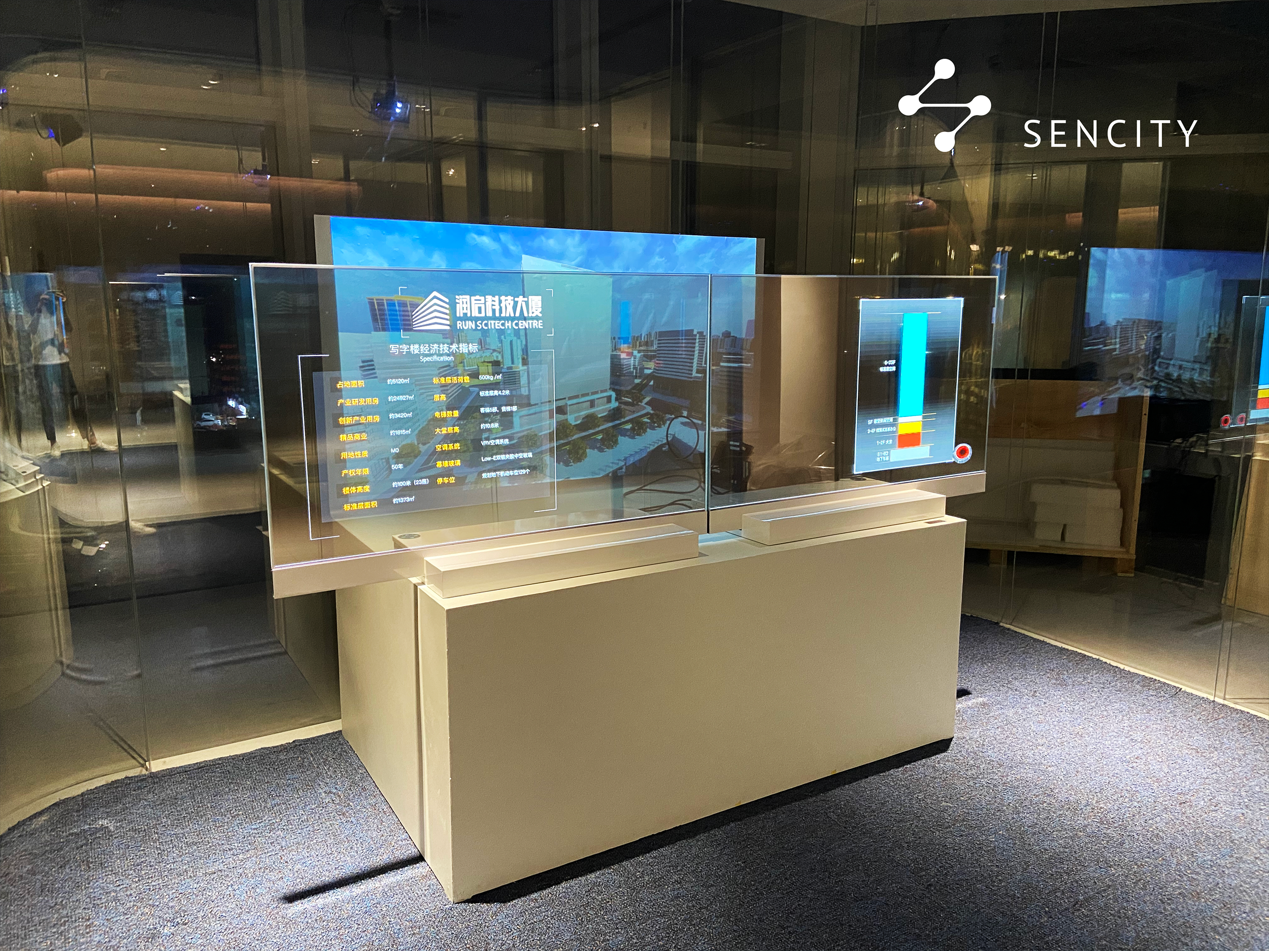 SenMage creates an immersive interactive holographic environment with the use of multiple borderless see-through screens and projectors, the latest embedded interactive technology such as hand detection sensors and body detection radars. Visitors can navigate through unique journeys and understand the design concepts behind each area of the building by controlling the architectural model display without the need to touch the screens.