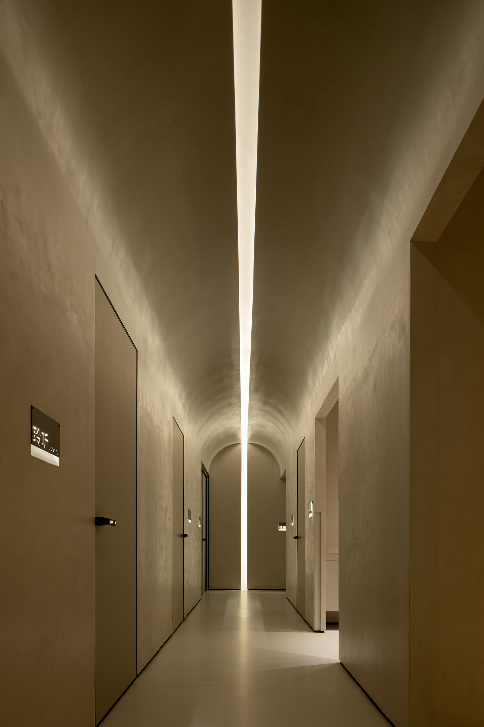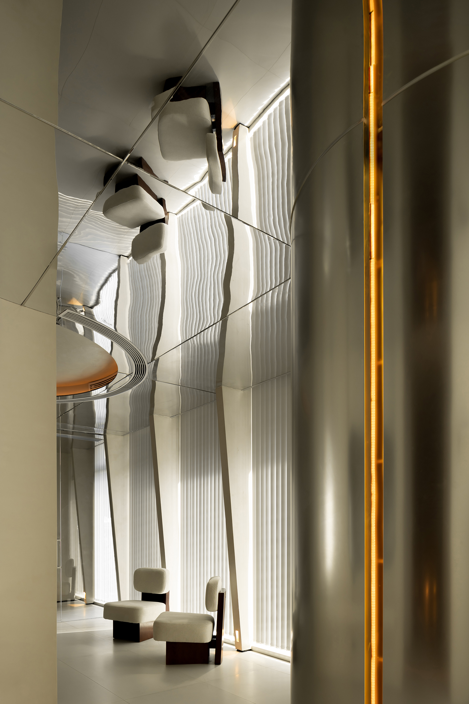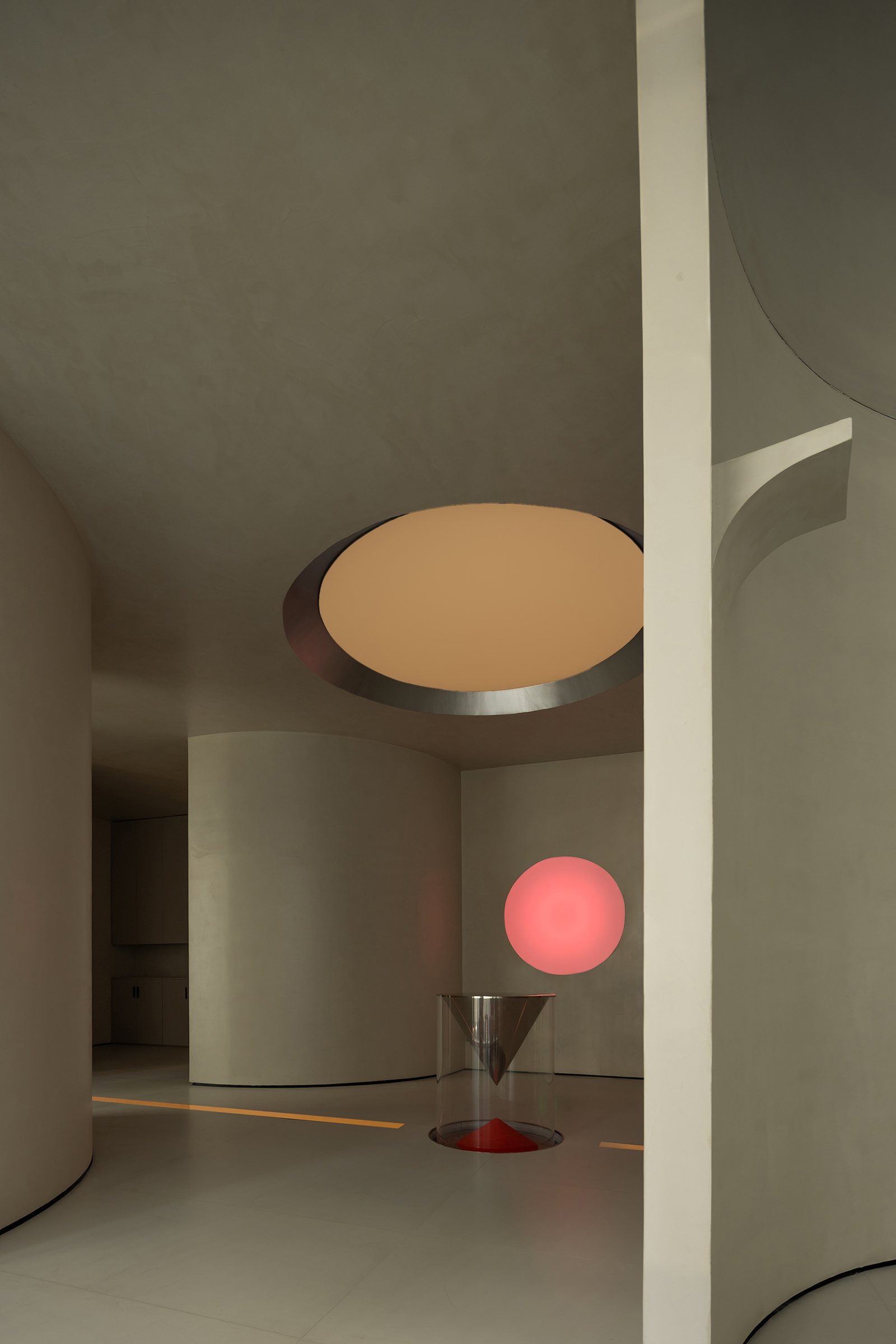 In the planning layout, four arc-shaped walls with a radius of 1.68m are built with the help of the faint axis of the lamp belt. They are collaged together in reverse to form a perfect circle, implying the continuous and cyclic time flow. "Cycle" is not only the brand name but also the concept core of precise positioning and scientific exploration of the brand. On the side of the window, a separate resting and waiting area are cut out. Below the ceiling of the main passage on the path, the mirrored stainless steel becomes the main surface texture. On the one hand, the reflection solves the problem of the low height of the space, and on the other hand, the clear boundary of the different interfaces is blurred. The soft shape and edges are related to the delicate skin of the human tissue, but also about touch, perception and more macroscopic embodied experience. The testing room, rest and waiting area, reception and passage are connected in series with each other, and there is no obvious boundary, which gives the space great plasticity. Internal wall and transparent glass as the main interval, virtual and real staggered, cold glass, heaven and earth one color soft wall texture and because of the vertical veil occlusion and faintly revealed "light wall", constitute a subtle, ingenious expression contrast.
