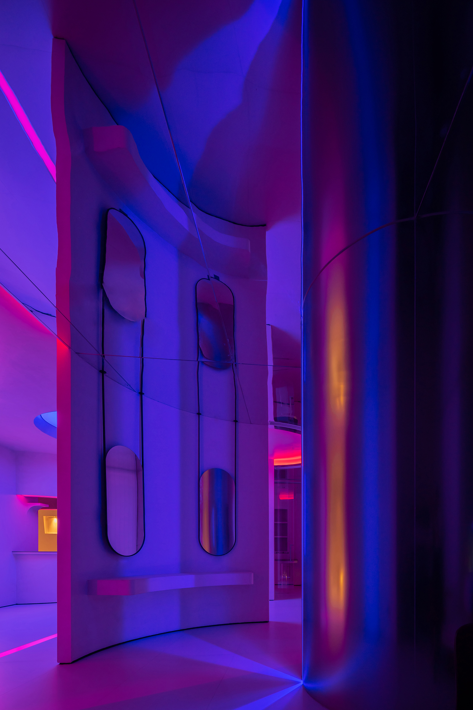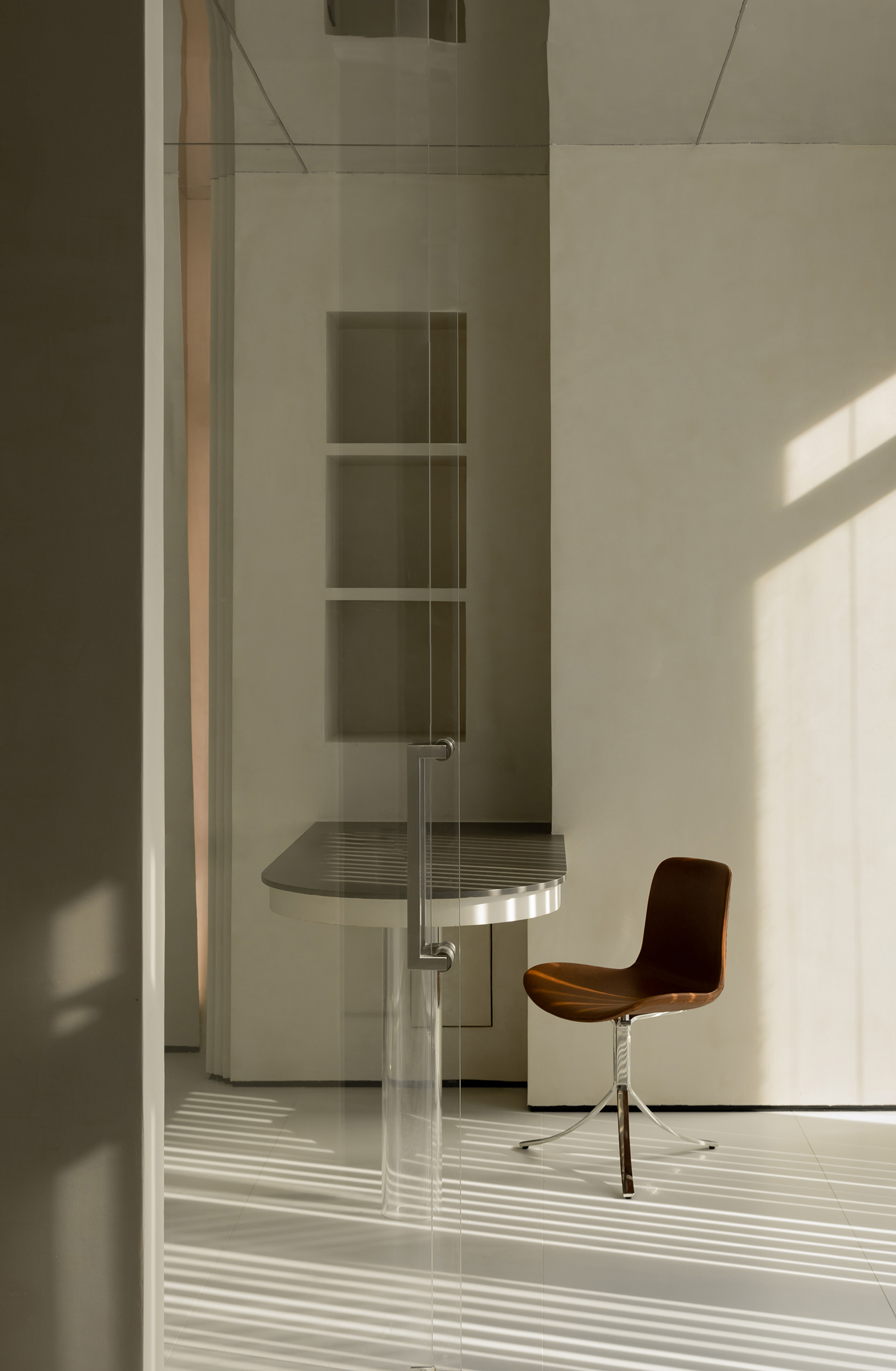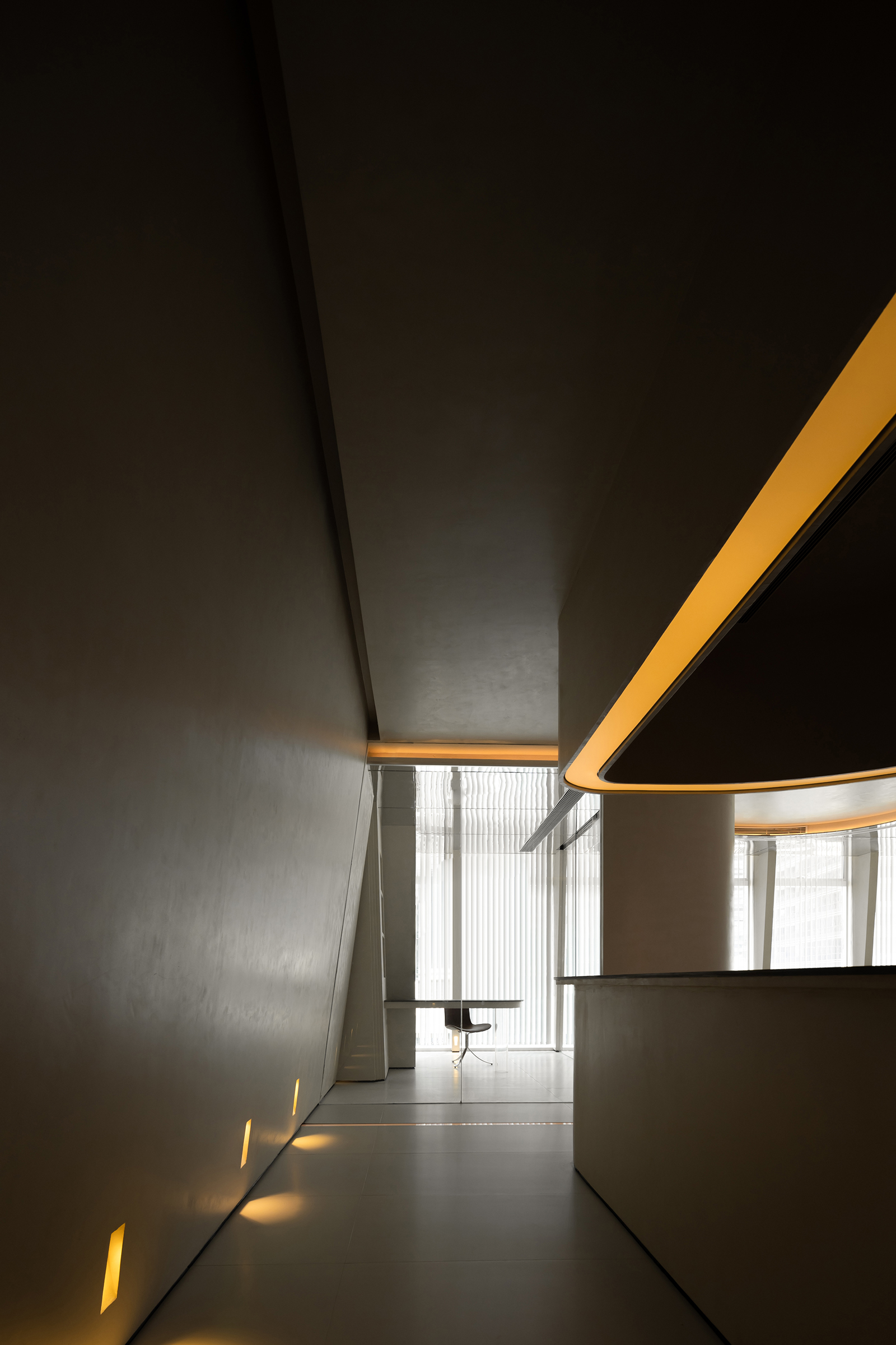 In the planning layout, four arc-shaped walls with a radius of 1.68m are built with the help of the faint axis of the lamp belt. They are collaged together in reverse to form a perfect circle, implying the continuous and cyclic time flow. "Cycle" is not only the brand name but also the concept core of precise positioning and scientific exploration of the brand. On the side of the window, a separate resting and waiting area are cut out. Below the ceiling of the main passage on the path, the mirrored stainless steel becomes the main surface texture. On the one hand, the reflection solves the problem of the low height of the space, and on the other hand, the clear boundary of the different interfaces is blurred. The soft shape and edges are related to the delicate skin of the human tissue, but also about touch, perception and more macroscopic embodied experience. The testing room, rest and waiting area, reception and passage are connected in series with each other, and there is no obvious boundary, which gives the space great plasticity. Internal wall and transparent glass as the main interval, virtual and real staggered, cold glass, heaven and earth one color soft wall texture and because of the vertical veil occlusion and faintly revealed "light wall", constitute a subtle, ingenious expression contrast.