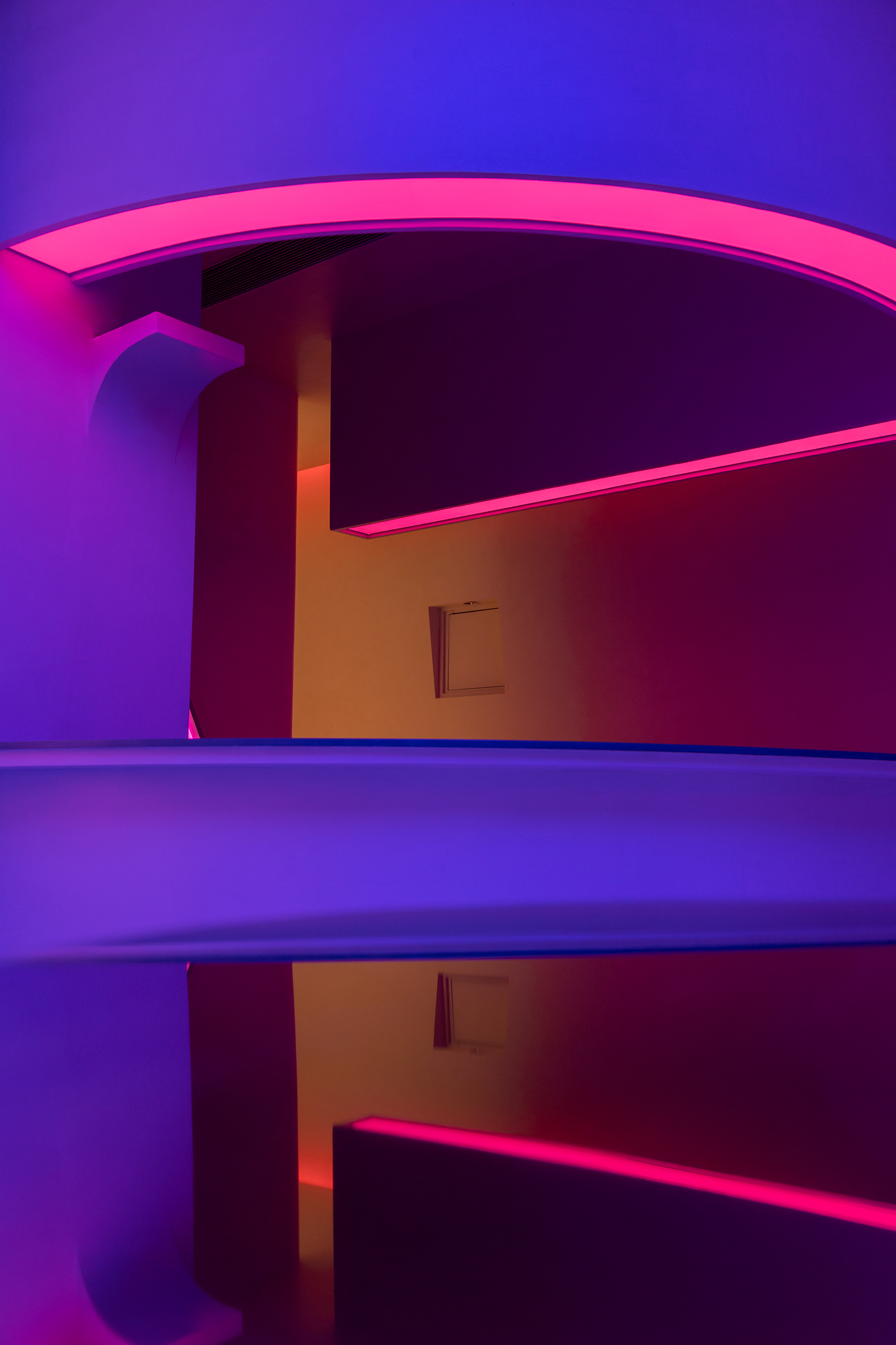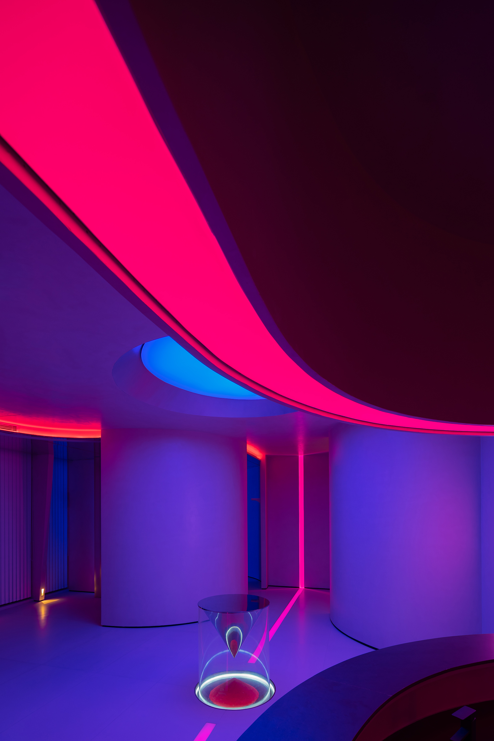 Cycle laboratory CYCLELAB with light programming technology, according to the different time nodes between day and night and adjust the lighting setting, light, dark, dark, a saturation of red, blue, yellow and so on set off a refreshing, changing myriad of "cyberpunk" like the sense of technology. Customers visiting at different time periods can experience different lighting moods and space atmospheres.