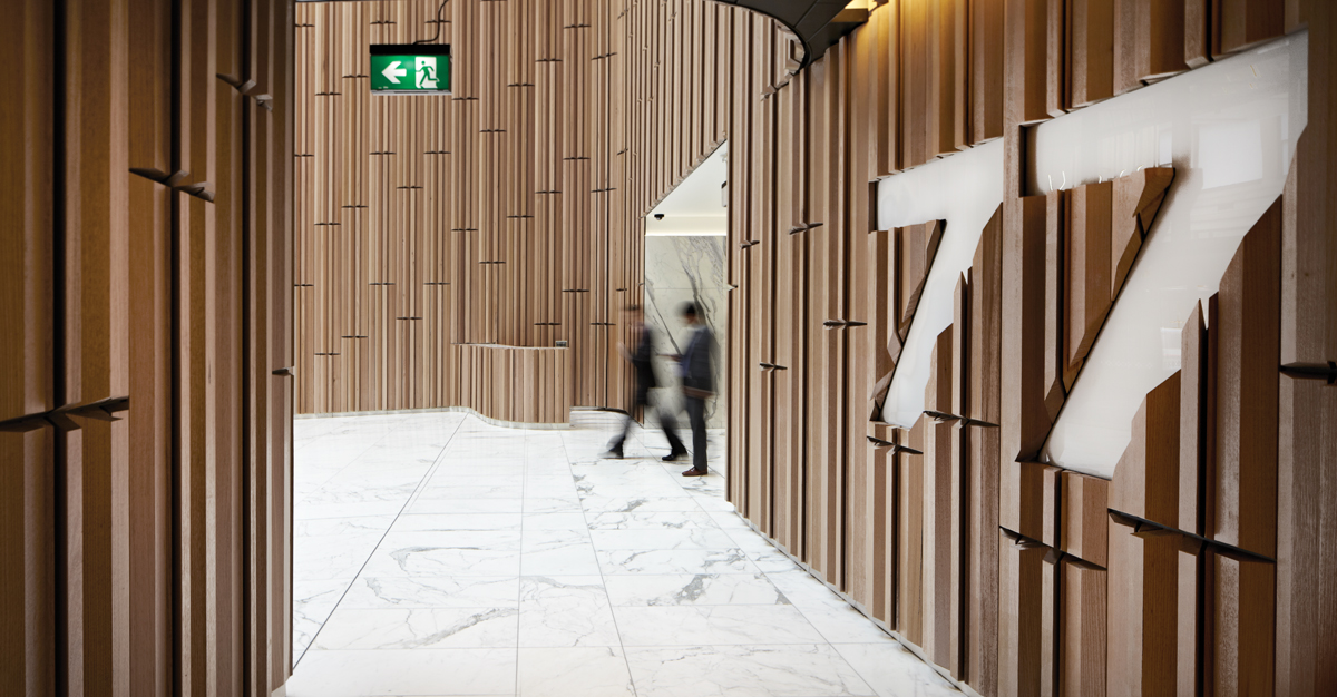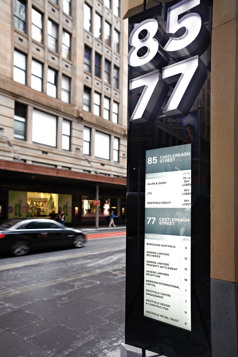 Büro North worked closely with John Wardle Architects to develop a wayfinding strategy and design concept that enabled users to navigate the expansive lobby space at the new 77-85 Castlereagh Street development in Sydney.