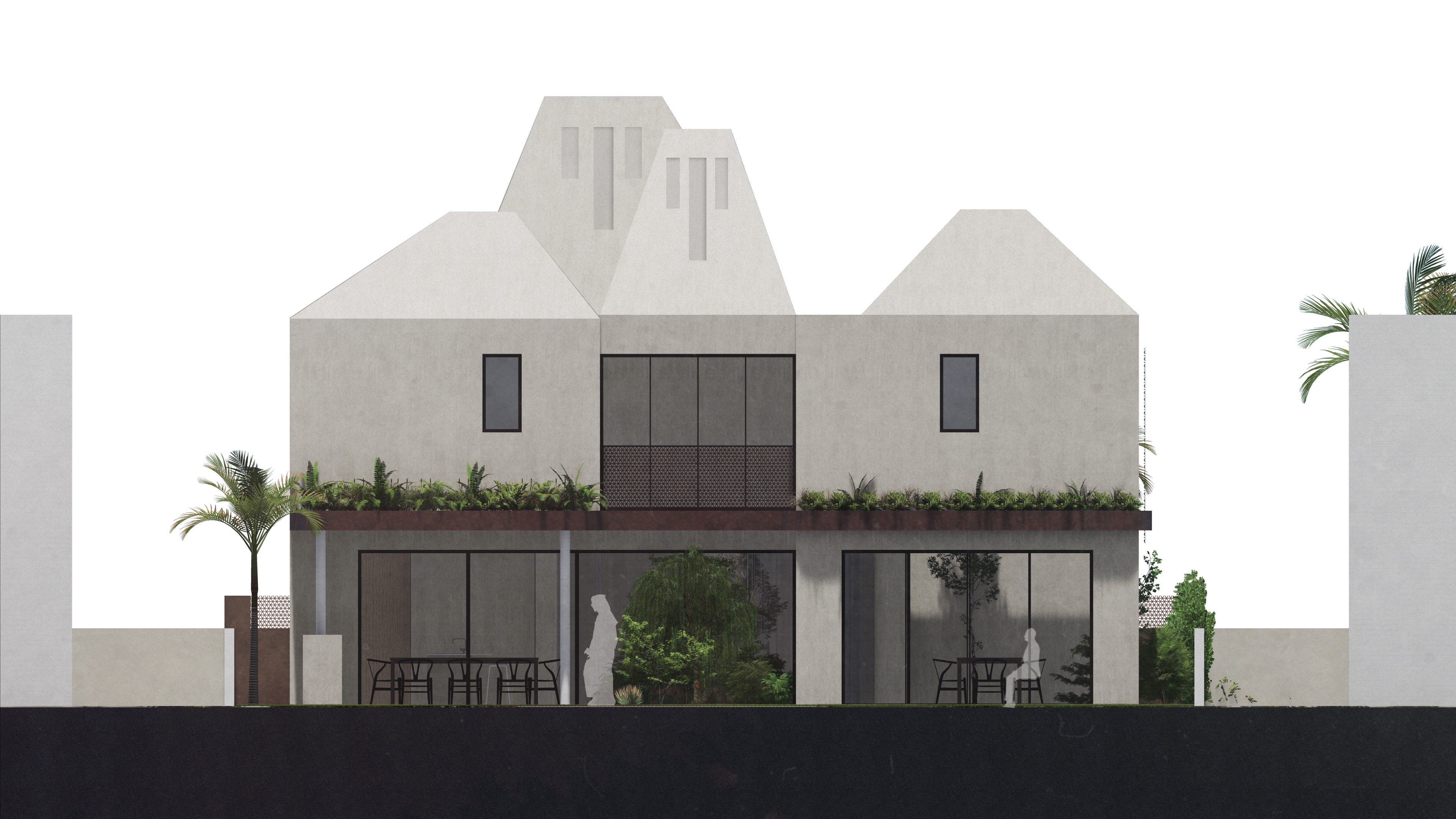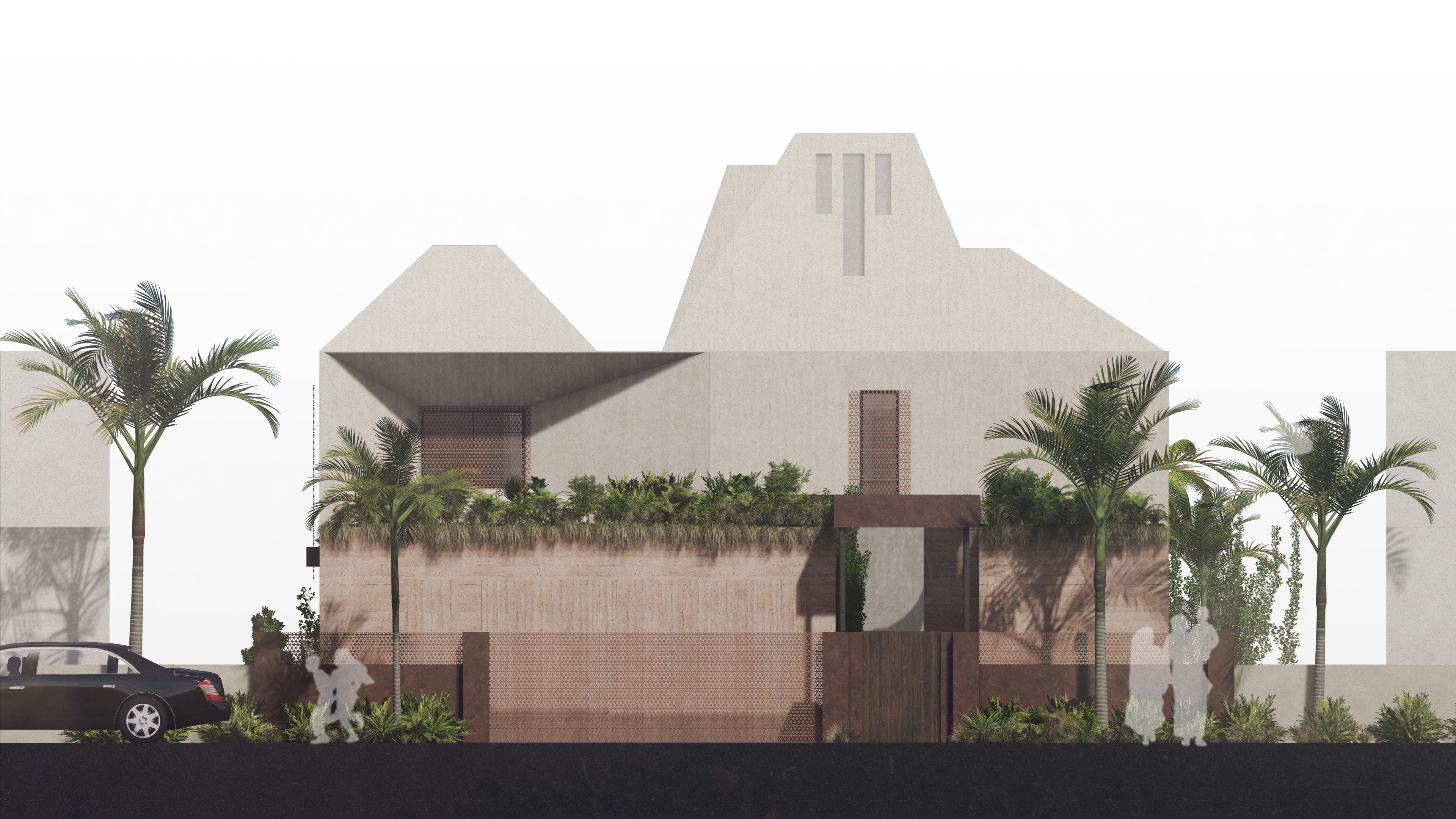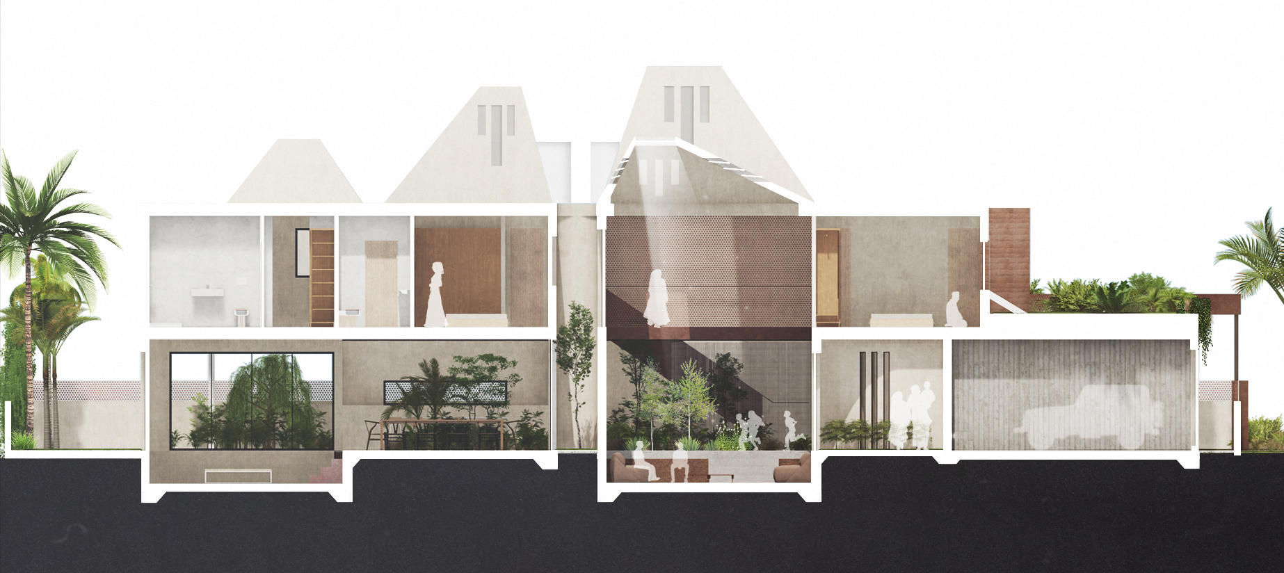 The Ruh House concept was submitted to the United Arab Emirates' House of the Future competition in 2023. The brief was to design an affordable family home that met the specific needs of Emirati families living in Dubai. These included 4-5 bedrooms and 4-6 bathrooms, an exterior service block with laundry and kitchen facilities, a garden and parking for two cars. Other considerations were privacy provisions and cultural expectations around gender and modesty, as well as a household flow that supports the rhythm of daily family life in Dubai.