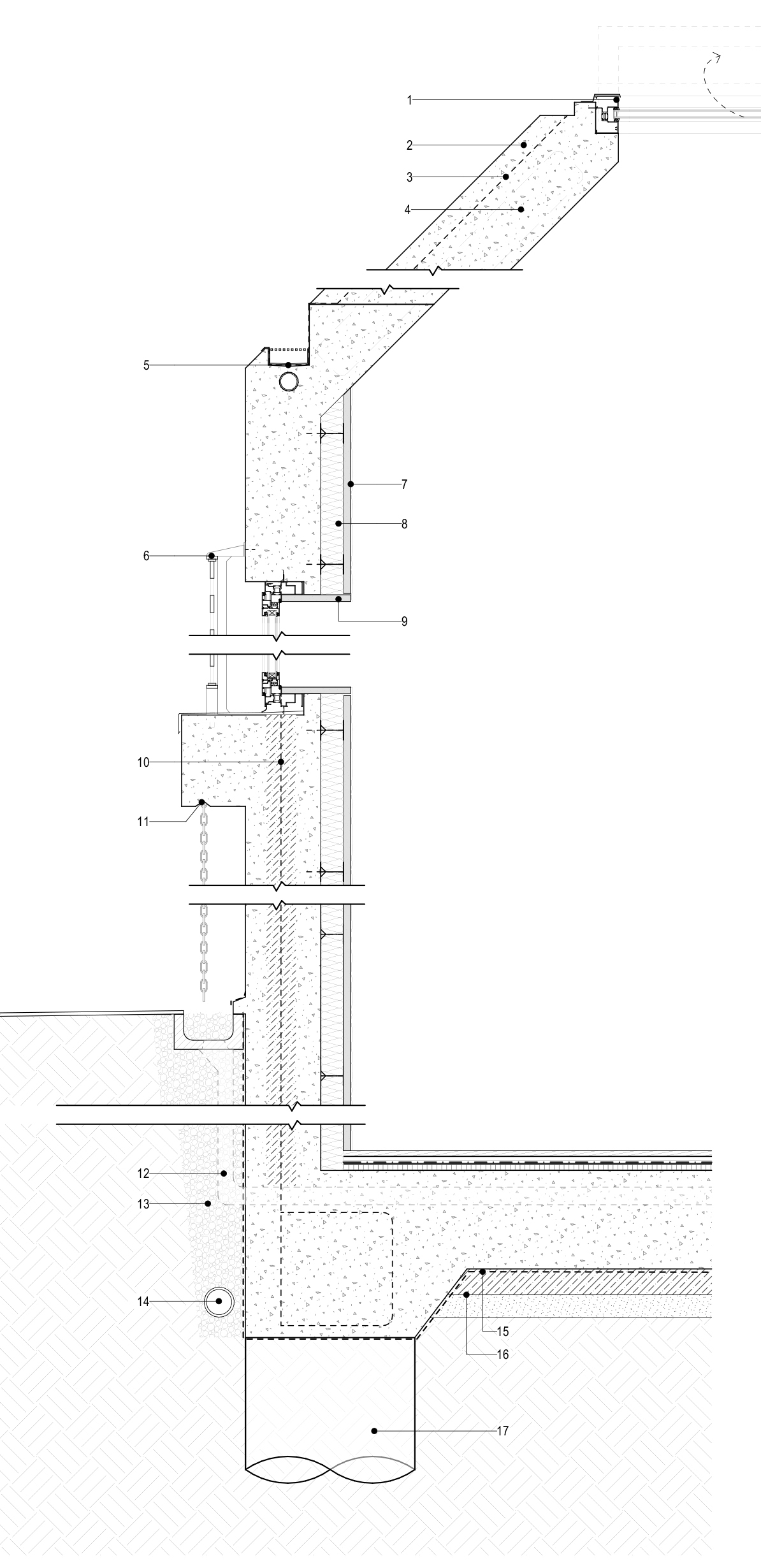 Perforated steel screens and stainless steel mesh curtains provide solar shading and facilitate air flow.