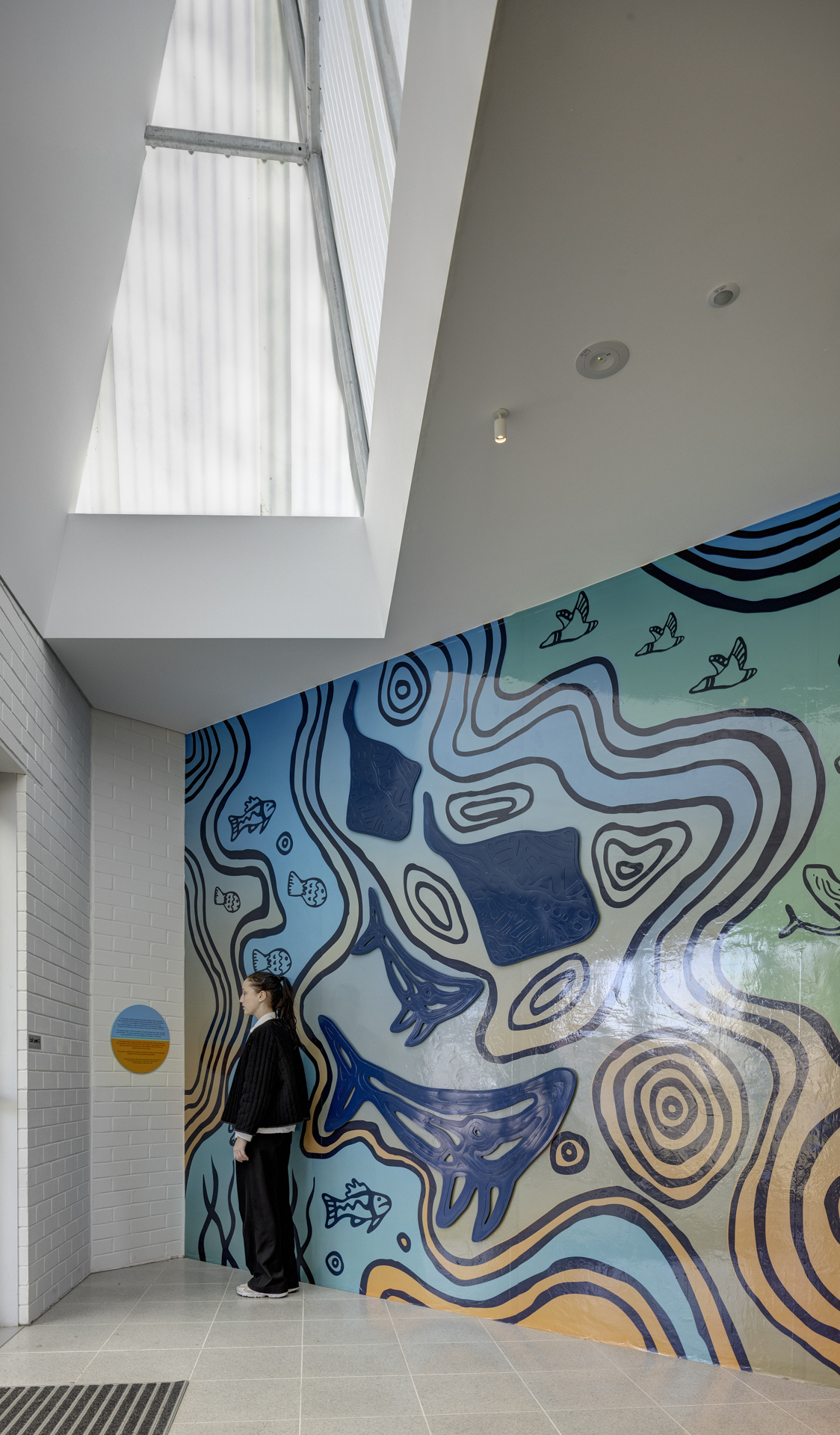 A welcoming entrance features a mural by an Indigenous artist and local Aboriginal high school students, emphasising community connection. This multi-functional space serves diverse activities—dance, yoga, sports, cultural events—to create a lasting community asset.