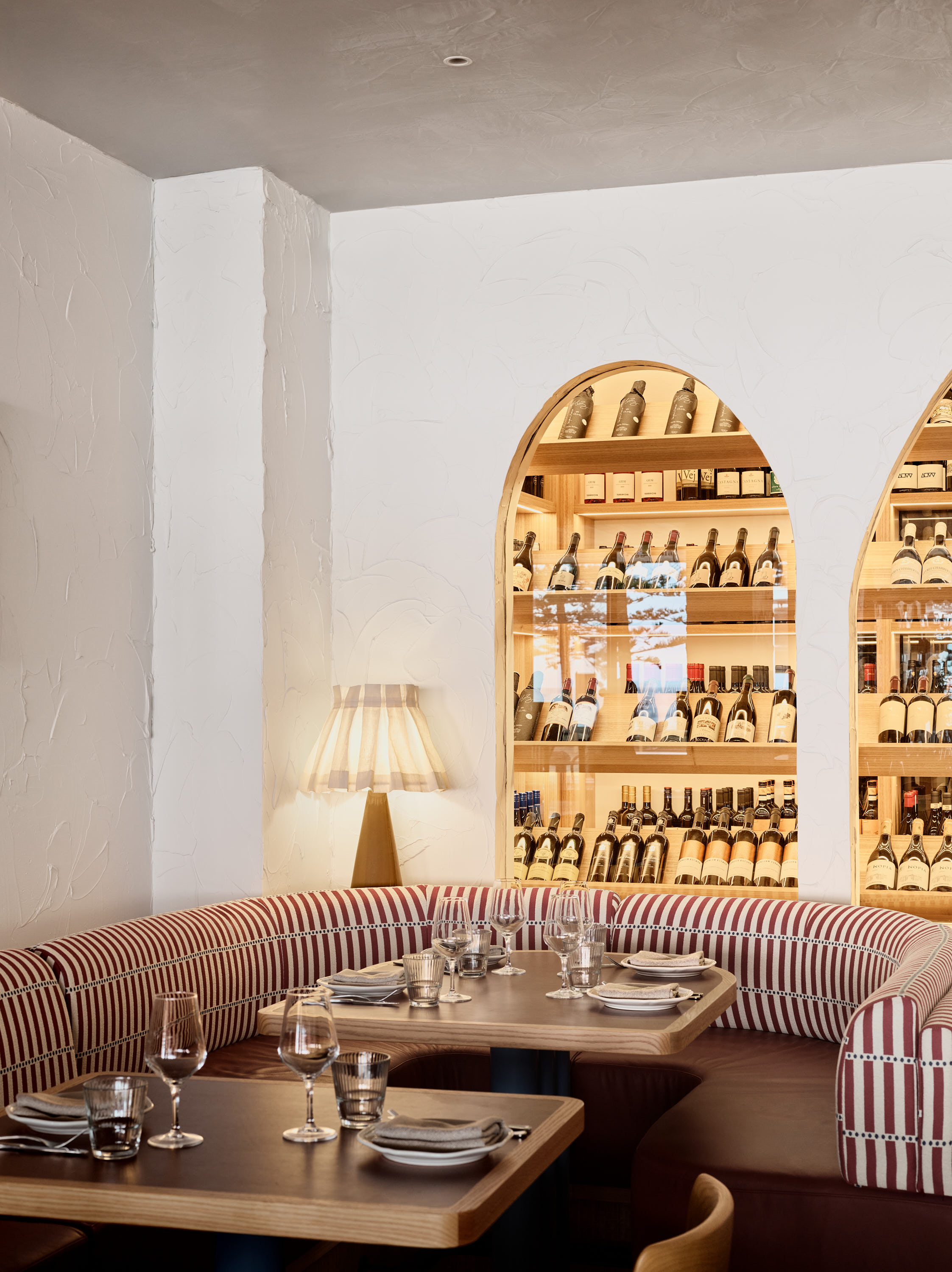 Our challenge was to brighten the setting (a former Japanese restaurant and bar that morphed into a club with a dancefloor) and optimise coastal outlooks. This resulted in raising low ceilings to their maximum height, adding a central slatted timber bulkhead to conceal services. Beneath, thickly frosted walls morph into grotto-like niches (including a trio displaying wine bottles).