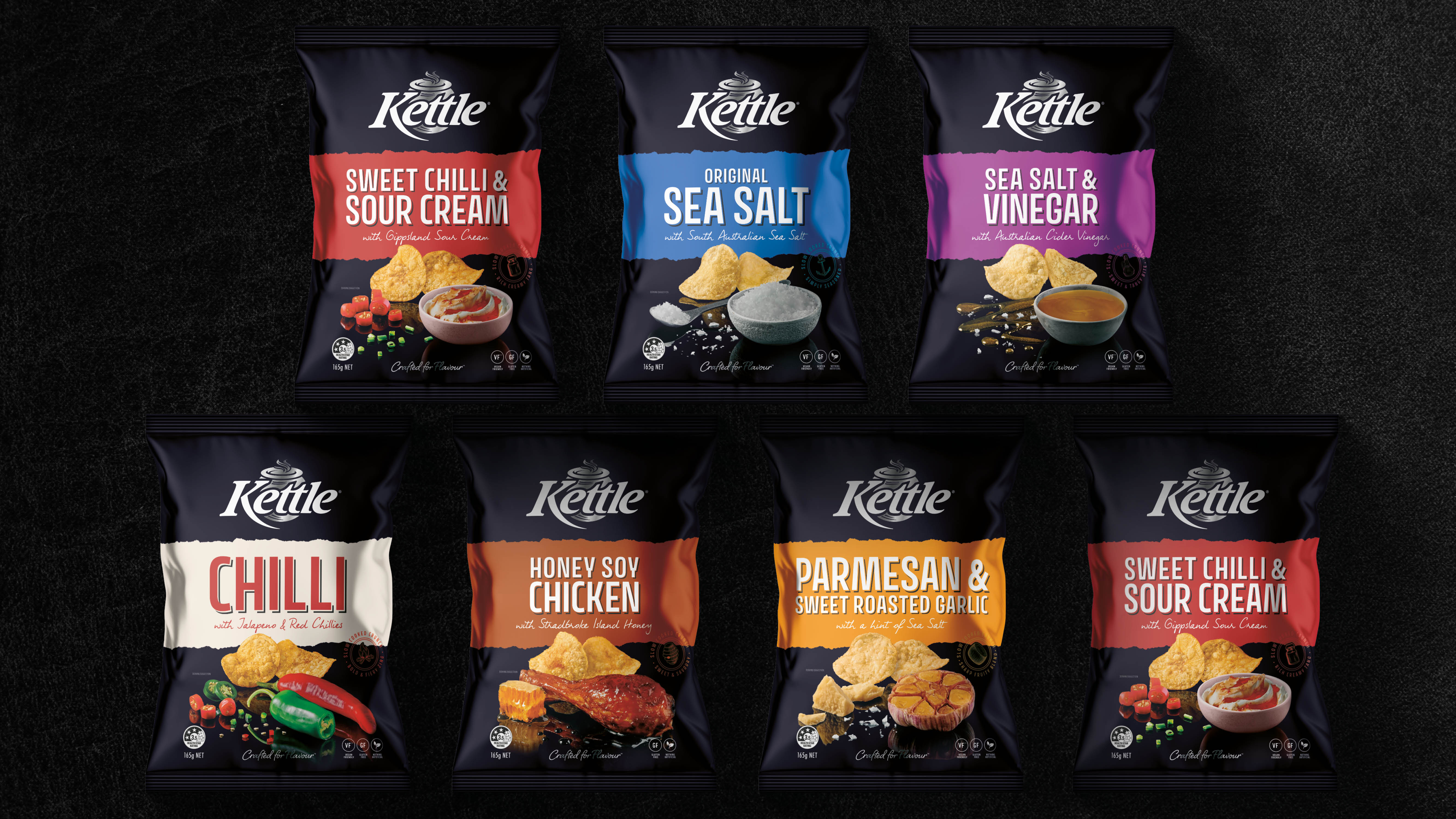 The distinctive Kettle stripe was retained, but refined as a crafted design cue. The brandmark was strengthened for increased shelf presence, while layouts were restructured to create consistency across core and sub-ranges.